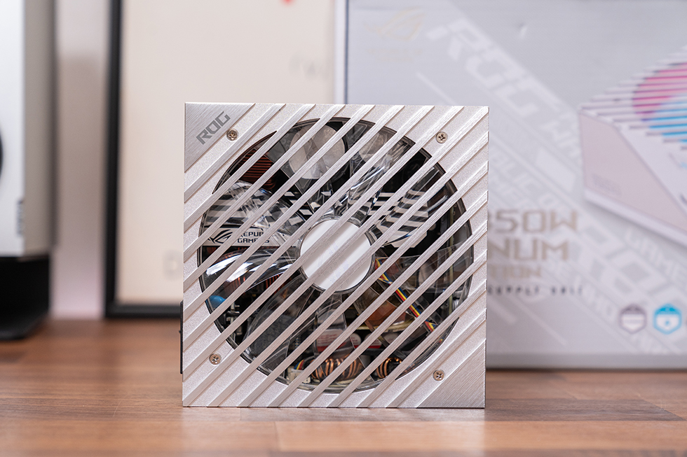 ROG LOKI 850W 电源的尺寸为125x125x63.5mm,标准SFX-L规格,顶部同样是采用了可拆卸式的铝制风扇格栅,下方安装的则是12015规格的轴流式风扇,扇叶末端带有风扇环,支持0 dB FAN智能停转,内配有 120mm 温控风扇,采用华硕的 Axial-tech 技术,可提供比标准电源风扇更高水平的风压,支持 Aura Sync 幻彩背光。