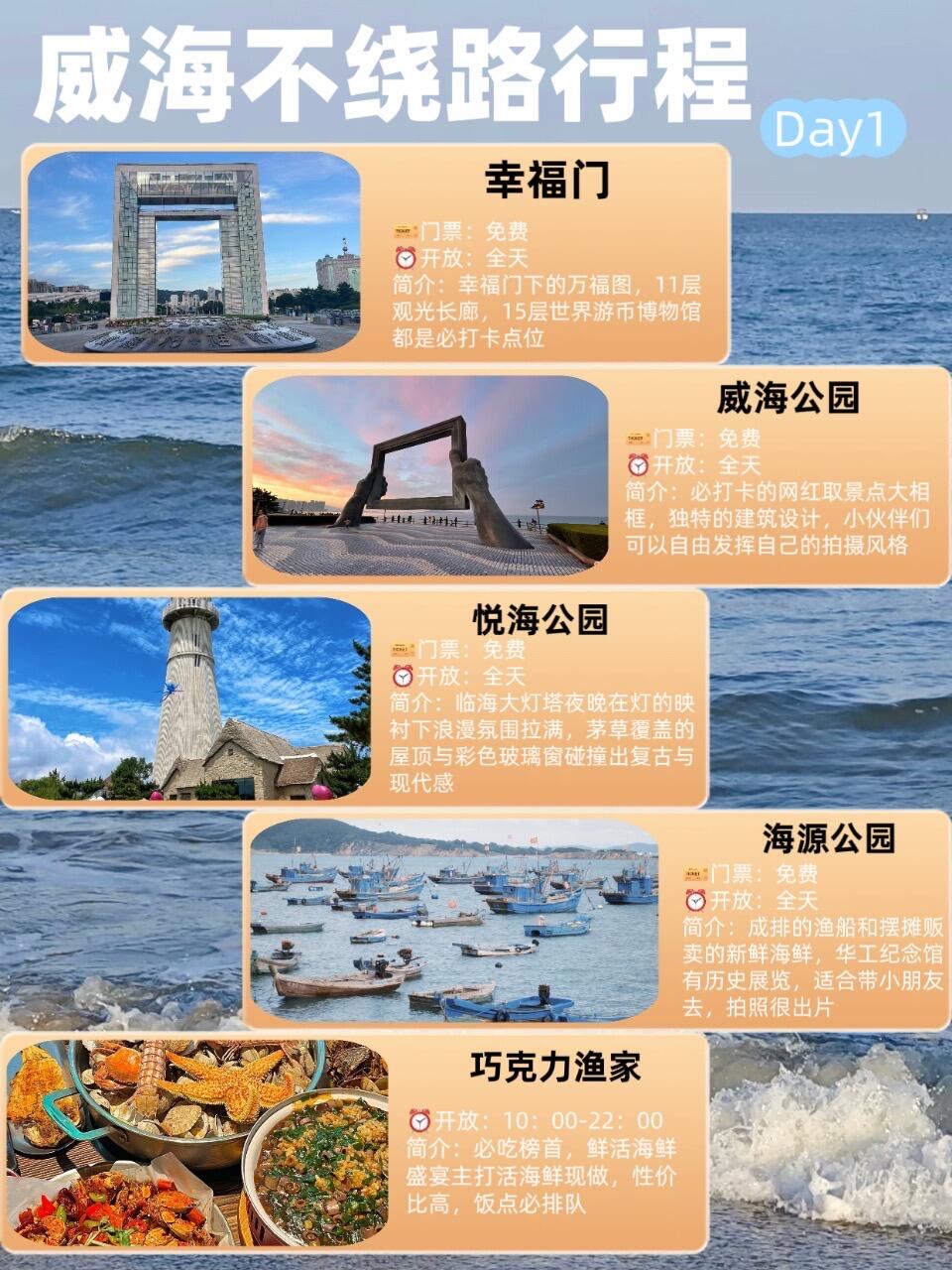 在幸福门可以脚踩万福图,也可以登顶俯瞰威海全貌,很漂亮,在网红大相框雕塑拍拍拍,再去悦海公园看看灯塔和草房子吧,太漂亮啦~最后你看看海源公园的渔船,还有果冻海,也太出片啦~