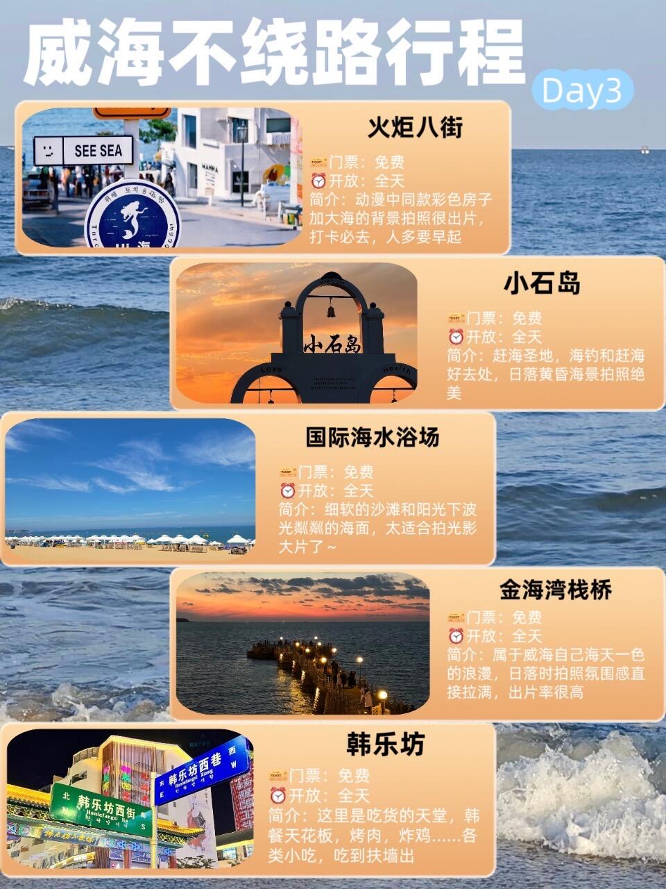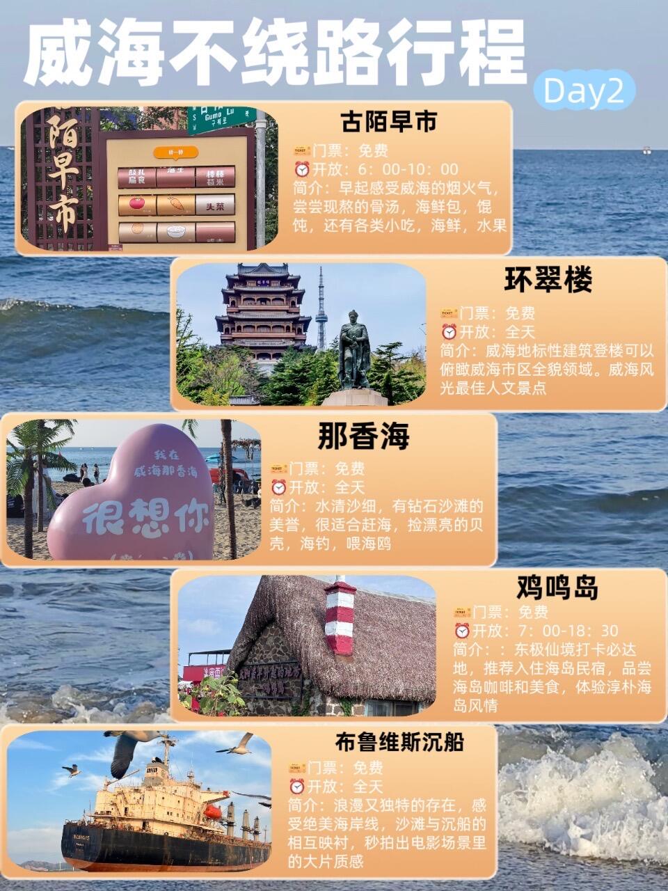 一大早就去古陌早市,去吃当地特色小吃,早点等,感受渔家烟火,去环翠楼逛逛,这里登顶也可以看到威海全貌,可以拍古装照片,去那香海感受一下钻石沙滩,喝喝咖啡,散散步,吹吹海风太舒服啦~最后你去布鲁威斯沉船拍拍拍,拍到停不下来~