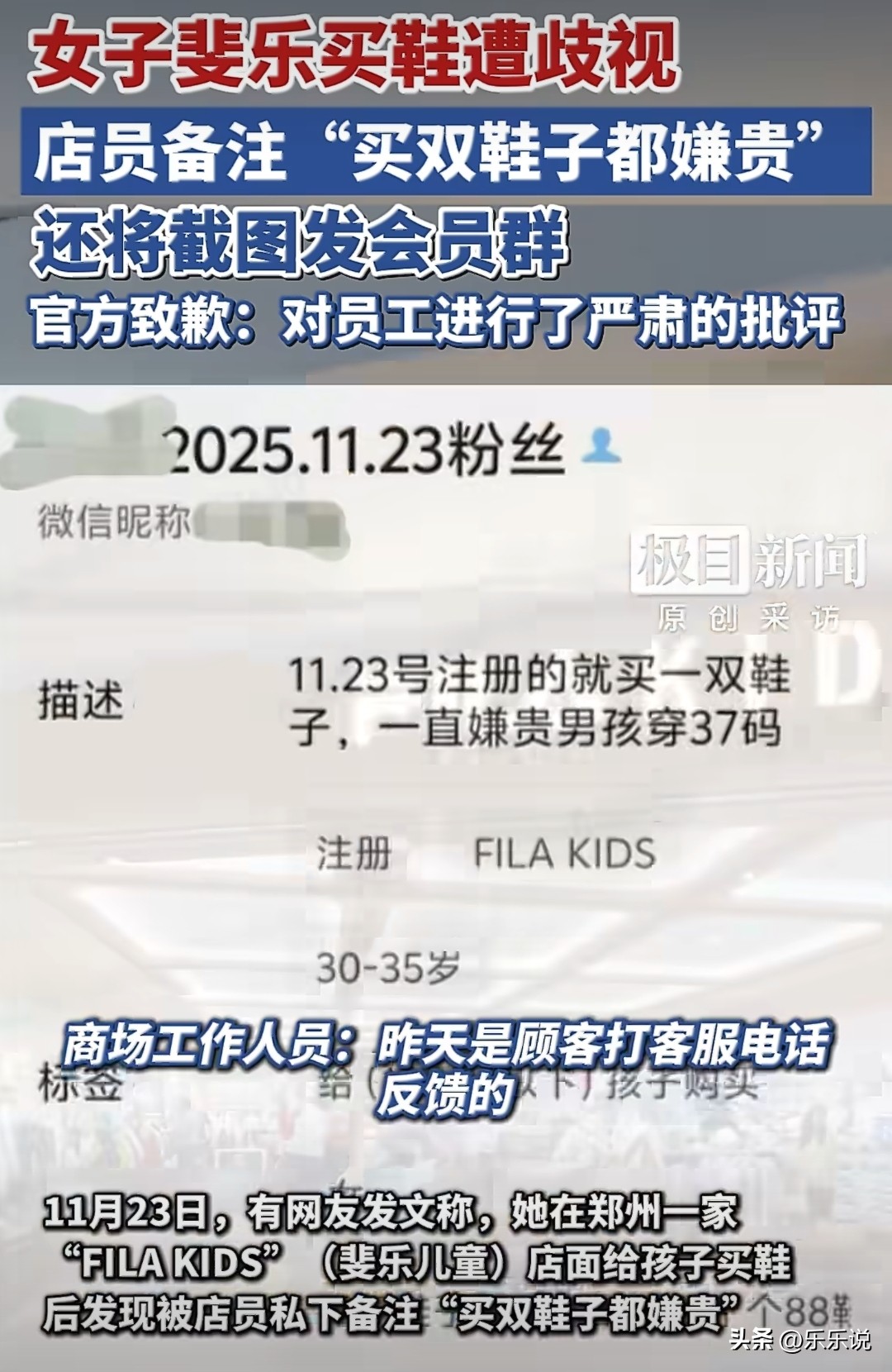 “本来以为网上那些都是段子,没想到发生在自己身上了。”一位在郑州斐乐儿童专卖店消费的宝妈,在购物后意外发现自己在店家的客户系统中被备注了极具侮辱性的标签。当这张截图被店员误发至上百人的会员群,一场关于消费尊严与隐私保护的舆论风暴骤然掀起。