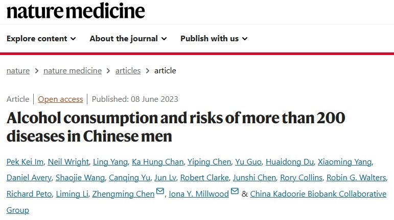 《Nature Medicine》上一项研究评估了我国成年男性饮酒与200多种疾病风险之间的关系,结果发现饮酒与61种疾病发生风险增加相关。