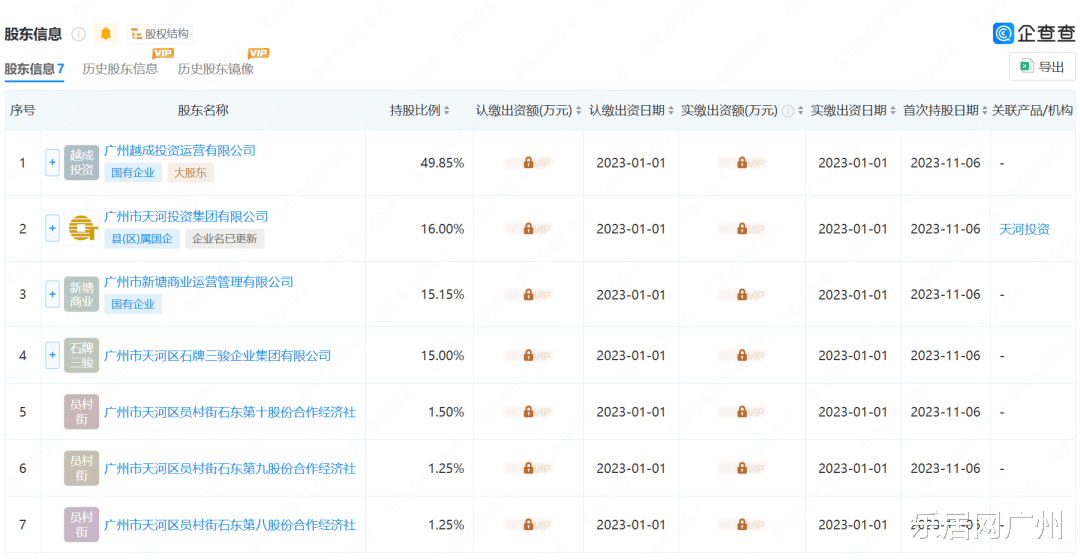 第二、三大股东是天河投资集团与新塘商业运营管理有限公司,共持股31.15%,背后对应天河区政府;