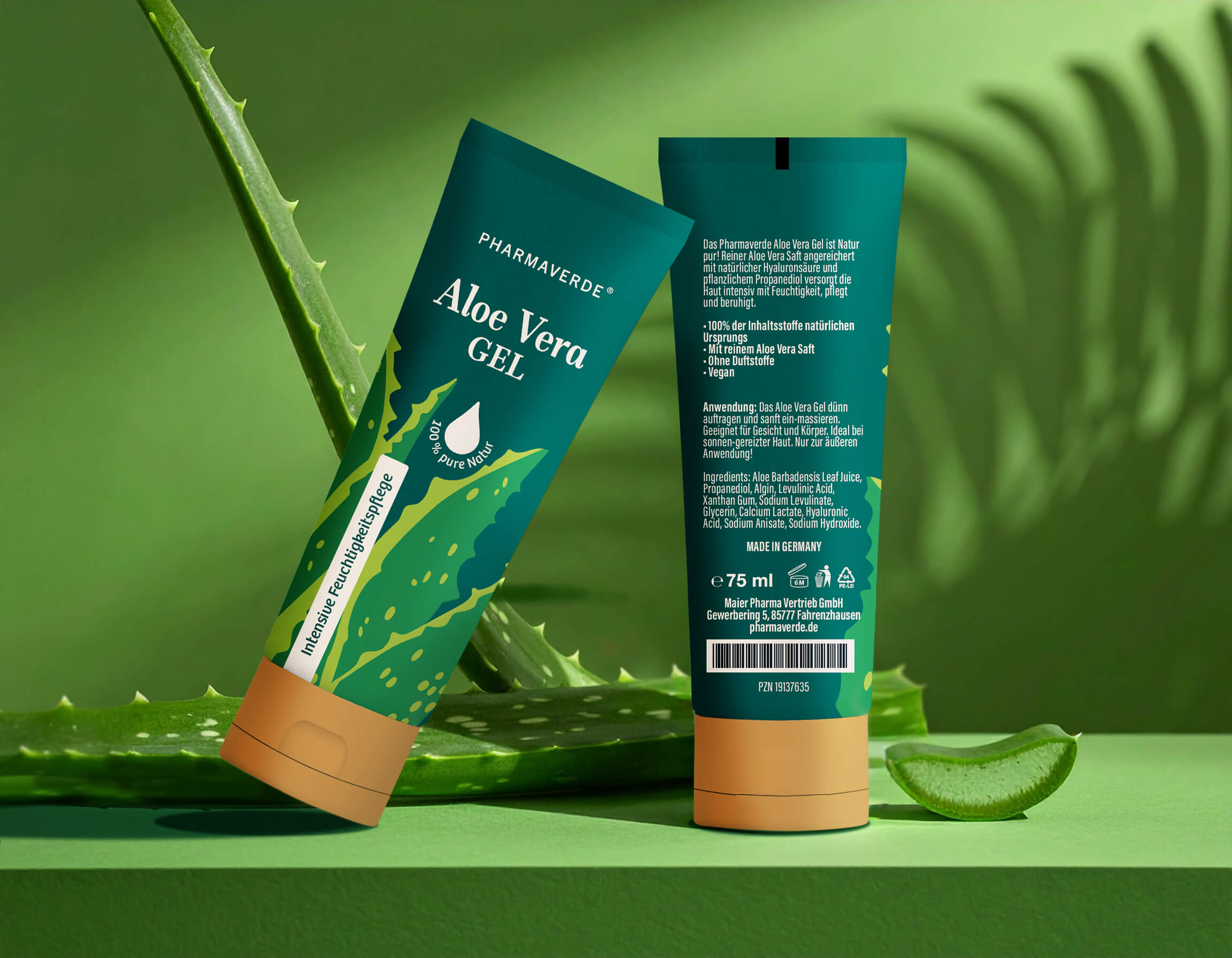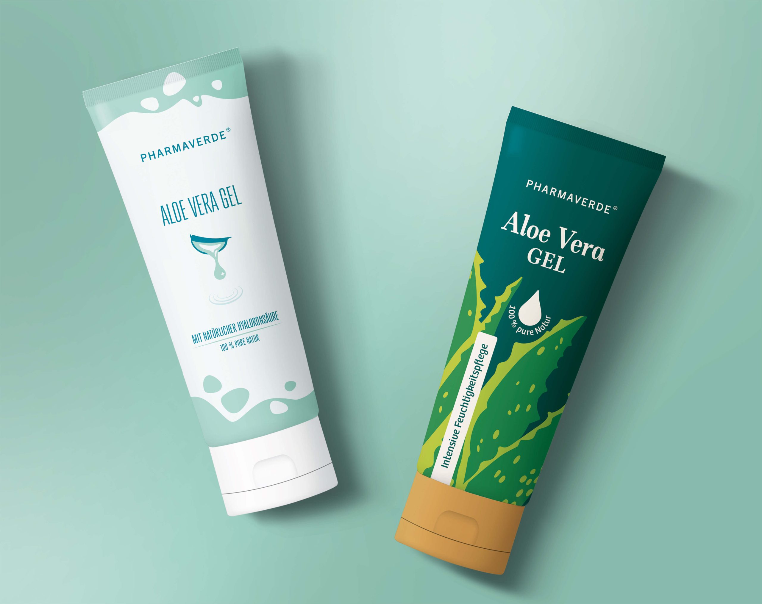 Pharmaverde 的芦荟胶包装,宛如一缕拂过晨露的清风,将自然之美与清新感受一并“装”进了设计之中。它摒弃冗余装饰,回归管状造型的本真,却在细节处尽显匠心。色彩上以白色为基调,搭配清新渐变的蓝绿与深绿,瞬间唤起人们对芦荟盎然生长的自然想象,传递出纯净、安全的信赖感。