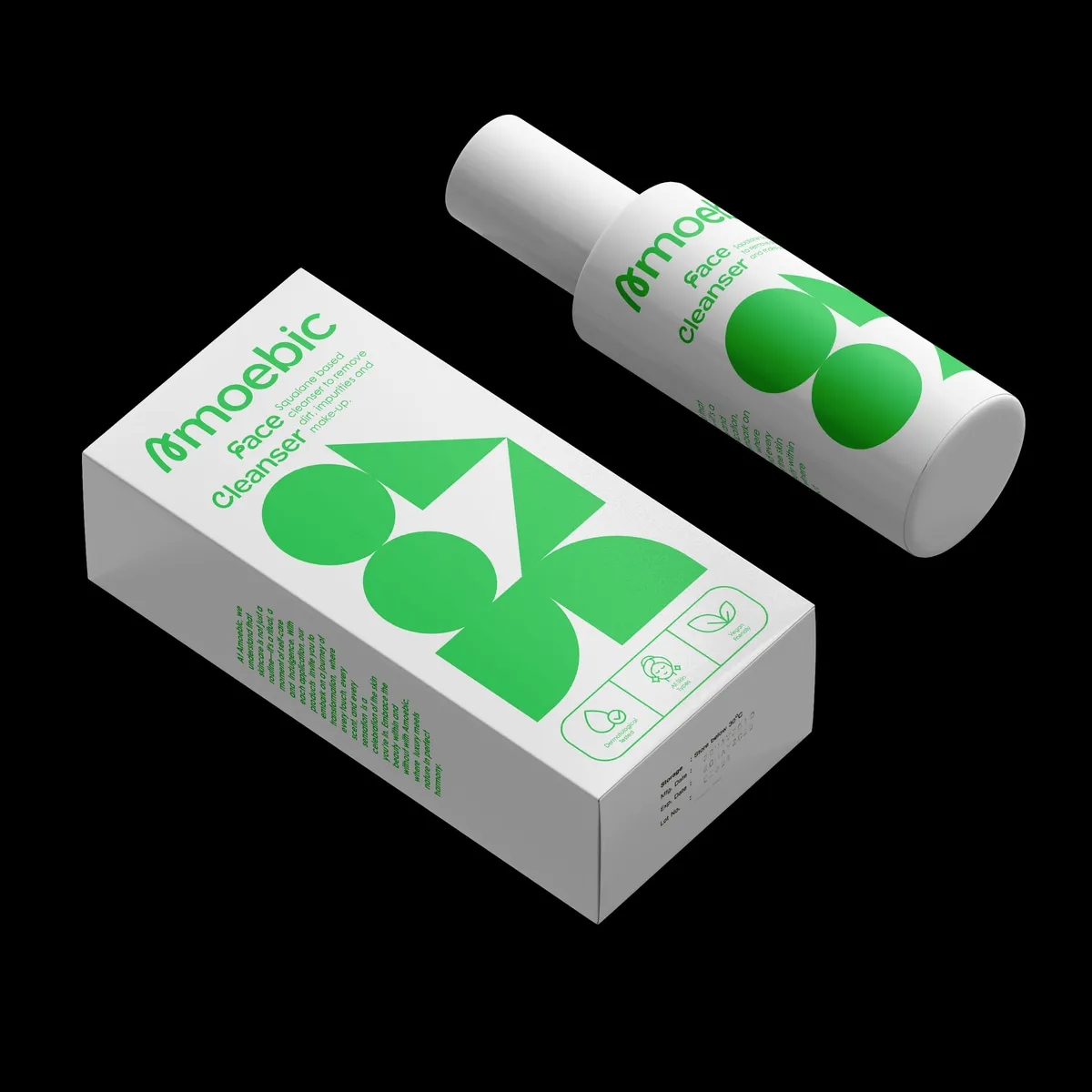 Moebic 的包装设计则选择了一条前卫而充满节奏的路径,如同一场精心编排的几何图形交响。纯净的白色瓶身与包装盒成为画布,其上跃动的绿色几何图形自由却不失秩序。每一个图形都经过严谨推敲,以出人意料的组合方式构建出强烈的视觉张力,令人过目难忘。