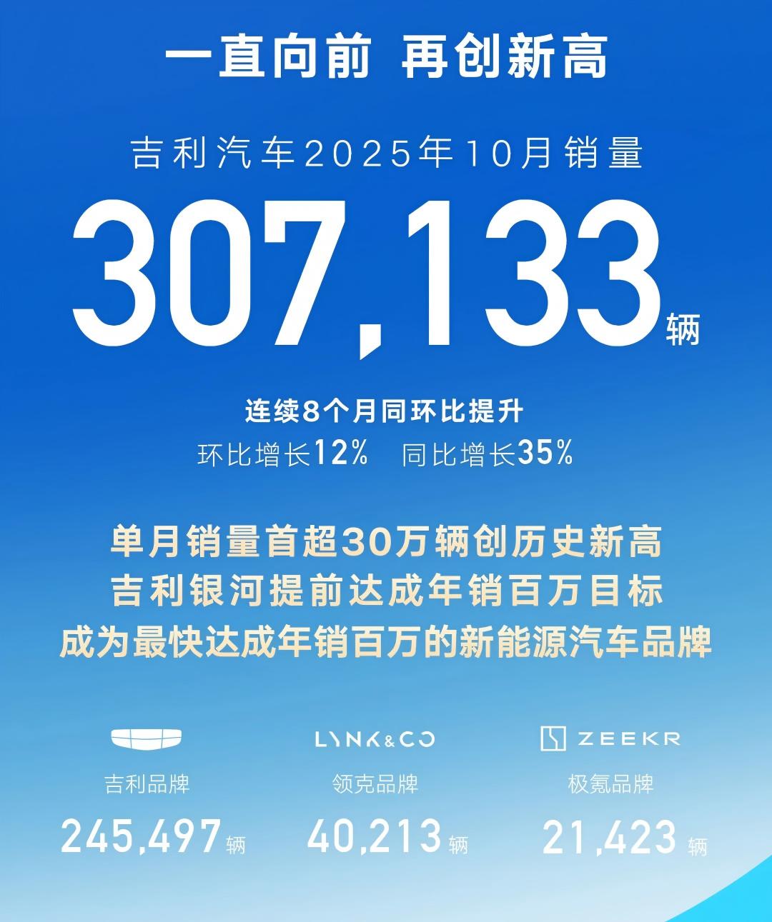 吉利:30.7万辆!连续8个月双增长,银河系列表现很亮眼,单月12.7万辆,同比翻倍!极氪001焕新版7分钟订单破万,星愿纯电版靠800V快充收割年轻人。更绝的是,吉利银河提前3个月完成百万销量目标,率先成为破百万的新能源品牌!