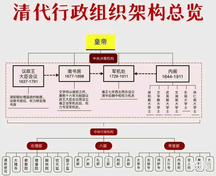 很多部门的新设,内在原因往往是随着封建王朝的发展,权力的争夺也更加的激烈,皇权的过度集中,那就是皇帝能团结的人越来越少,变成了真正的孤家寡人,而站在皇帝对面的人就会越来越多。所以到了封建帝国时代的末期,以明清为例,皇帝为了壮大自身力量,有加强宦官权力的,比如设立东厂西厂;还有实行严酷的监察制度,比如设立锦衣卫监察百官;同时皇帝还需要秘书,于是早期的内阁制度,以及清朝的军机处,就这么应运而生。