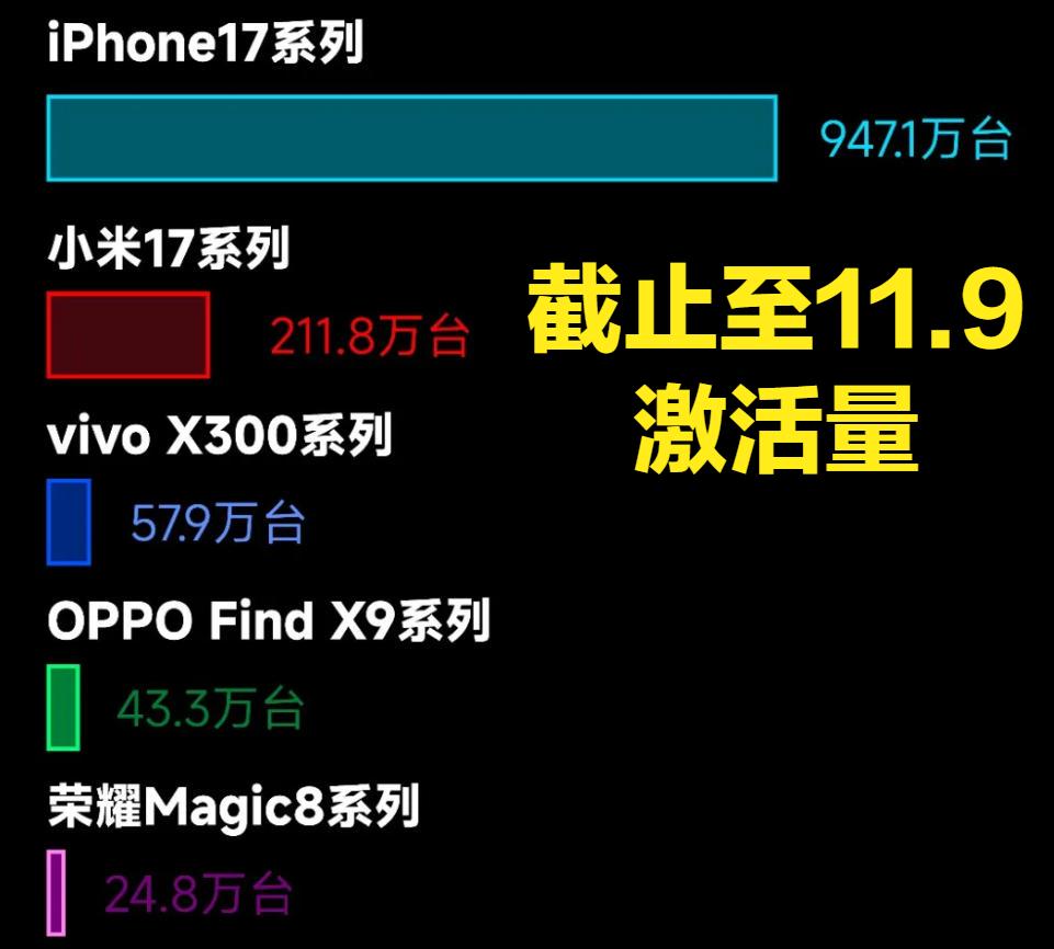 此外,机构的数据显示,到11月9日时,iPhone17系列在中国激活量超过了1000万,是其它国产旗舰手机的N倍,也远超前几代手机。