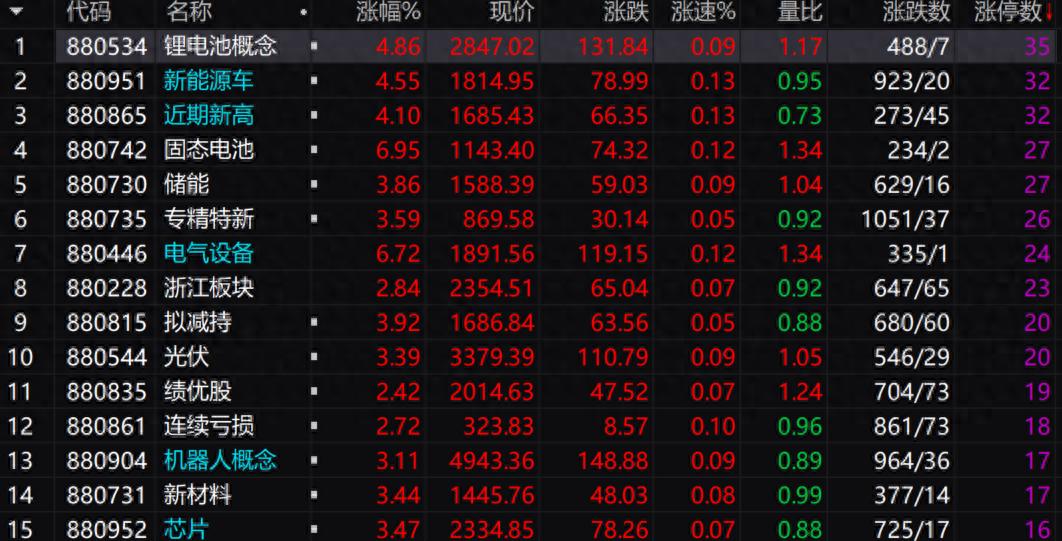盘面上,涨停家数多的板块锂电池,新能源车,固态电池,电气设备,光伏,机器人等,其中持续三天涨幅较大的电气设备,固态电池,锂矿。个股涨幅和板块联动效应,有持续性,金银河、华盛锂电等多股冲击20CM涨停,近期锂矿股强势,上涨驱动力主要来自于中国潜在的减产预期。同时我们看到消费板块也有异动情况,随时国庆中秋的到来,消费还是有一定上涨预期的,但只是作为大盘调整中防守的选择,大盘上行还是选择主流资金持续流入方向为宜。