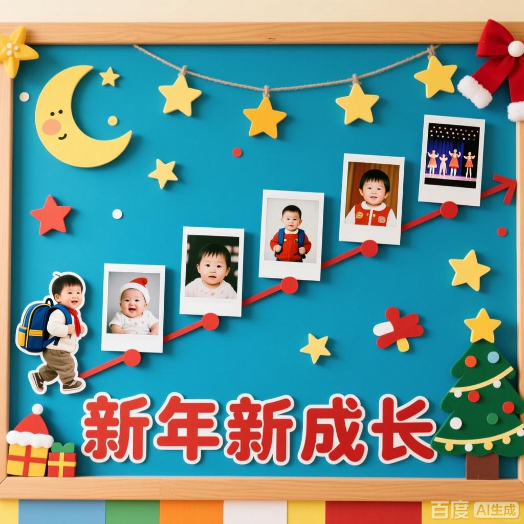 科普元旦知识之外,我们还可以从小朋友本身入手,构思环创内容。比如对比小朋友们一年前和现在的照片,客观展示其成长变化。或者排列儿童一年来在幼儿园中参与的重大活动,记录其成长轨迹。这不仅能帮助小朋友们理解时间观念,更能增长其对园所的归属感和认同感。