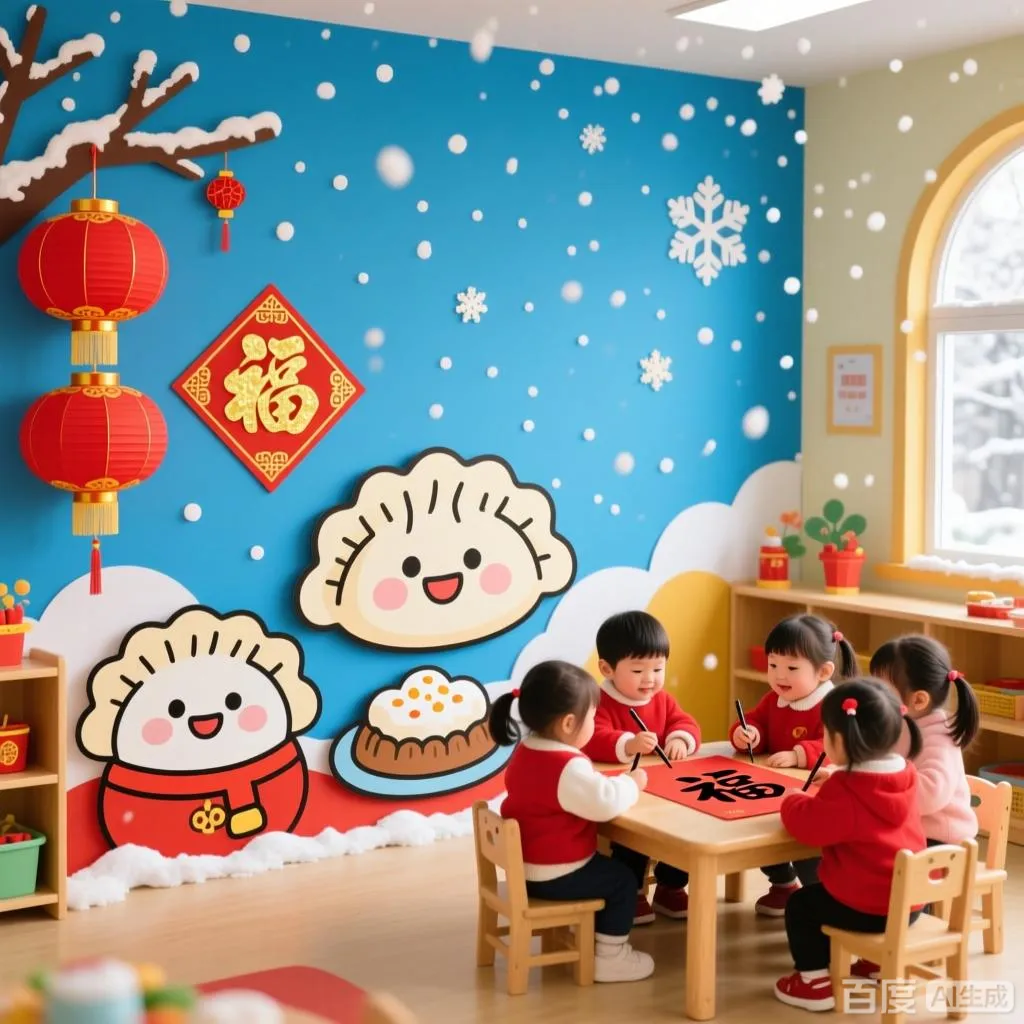 新年习俗也是一个极佳的环创主题。比如,在中国古代元旦和春节指的是同一个节日。每到此时家家户户燃放爆竹,祭拜神灵,吃年糕,吃饺子等。现代中国则将元旦和春节分开,元旦为公历第一天,人们往往出游、合家团圆等。但相比春节,其重要性要小得多。
