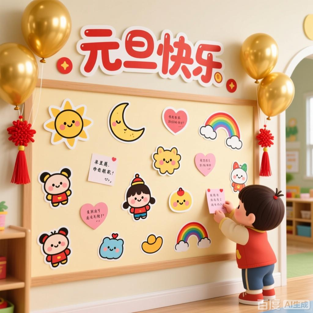 辞旧迎新,未来的每一天都是值得期待的。在元旦环创中我们可以引导小朋友们许下关于新一年的美好期望、计划或者心愿。这些美好的愿望会化成漂亮的“心愿墙”、“祈愿树”等在幼儿园中迎风招展,既督促孩子们行动起来,又传递温暖的力量。