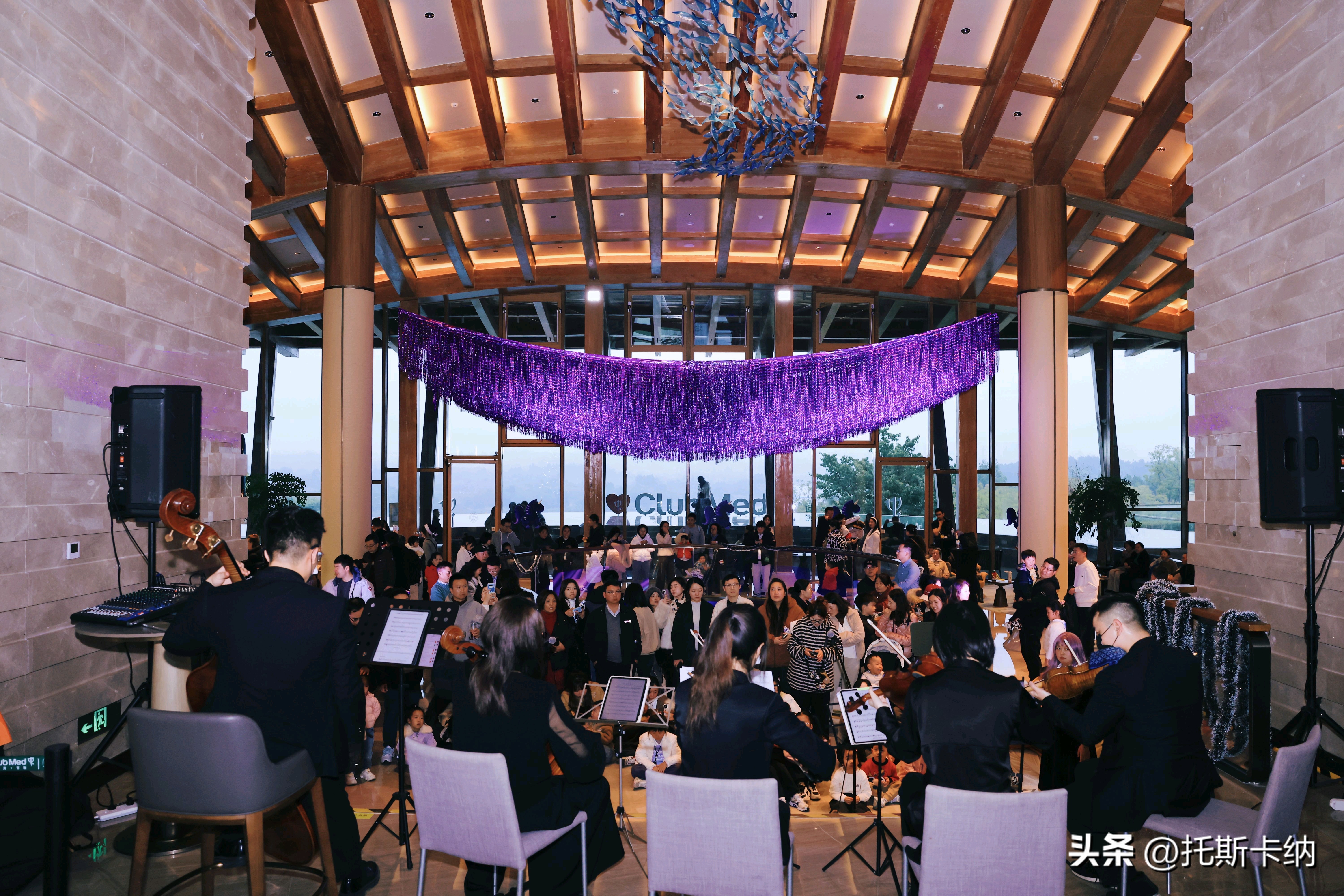 暮色起,爱乐乐团奏响欢快乐章,宾客齐聚大堂,恣享圣诞特调鸡尾酒。随后由度假村各部门员工组成的唱诗班闪亮登场,悠扬颂歌与节日旋律交织回荡,圣诞亮灯仪式拉开序幕。度假村总经理杨峻先生向在场宾客表达热烈欢迎并致以最诚挚的祝福,并邀请宾客移步户外圣诞树前,快乐管家G.O带来的动感快闪舞蹈,将庆典氛围推向高潮,最后在全场宾客的倒数声中,圣诞树被瞬间点亮,闪耀灯光绽放,圣诞季正式开启。