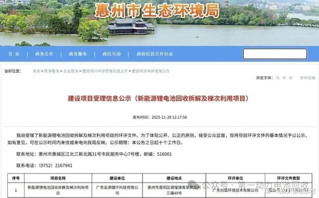 第一动力电池回收消息,近日,惠州市生态环境局发布了《新能源锂电池回收拆解及梯次利用项目》建设项目受理信息公示。