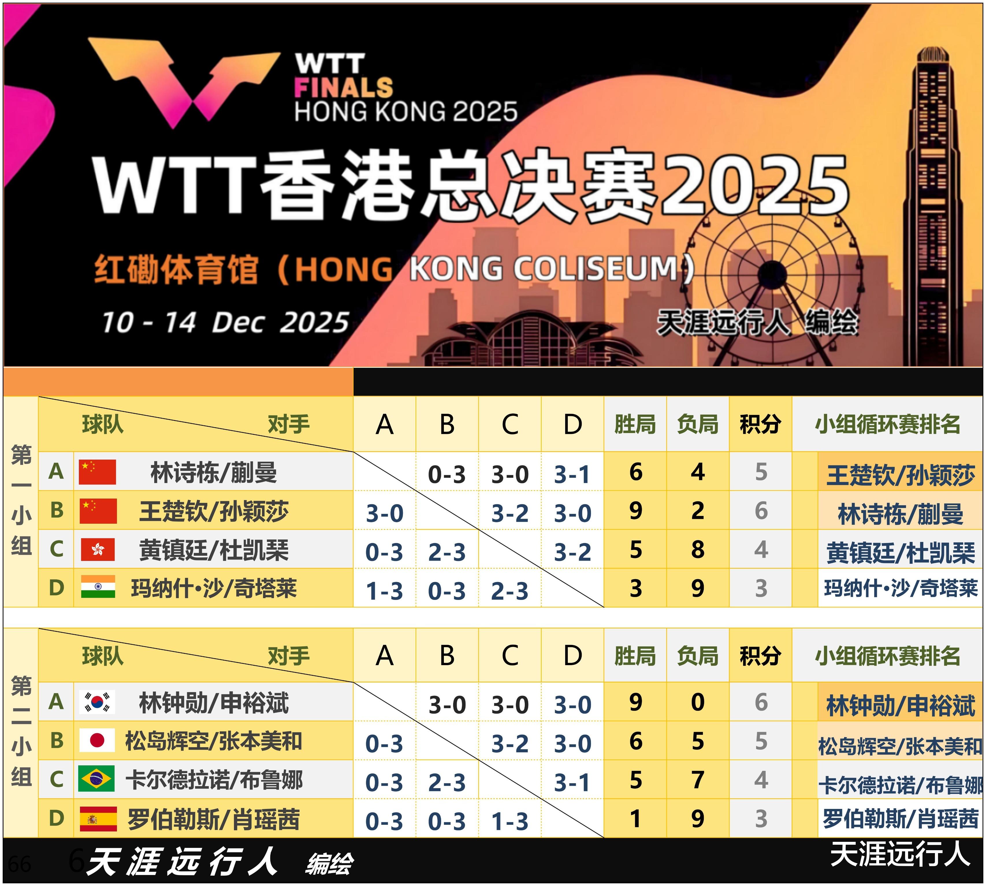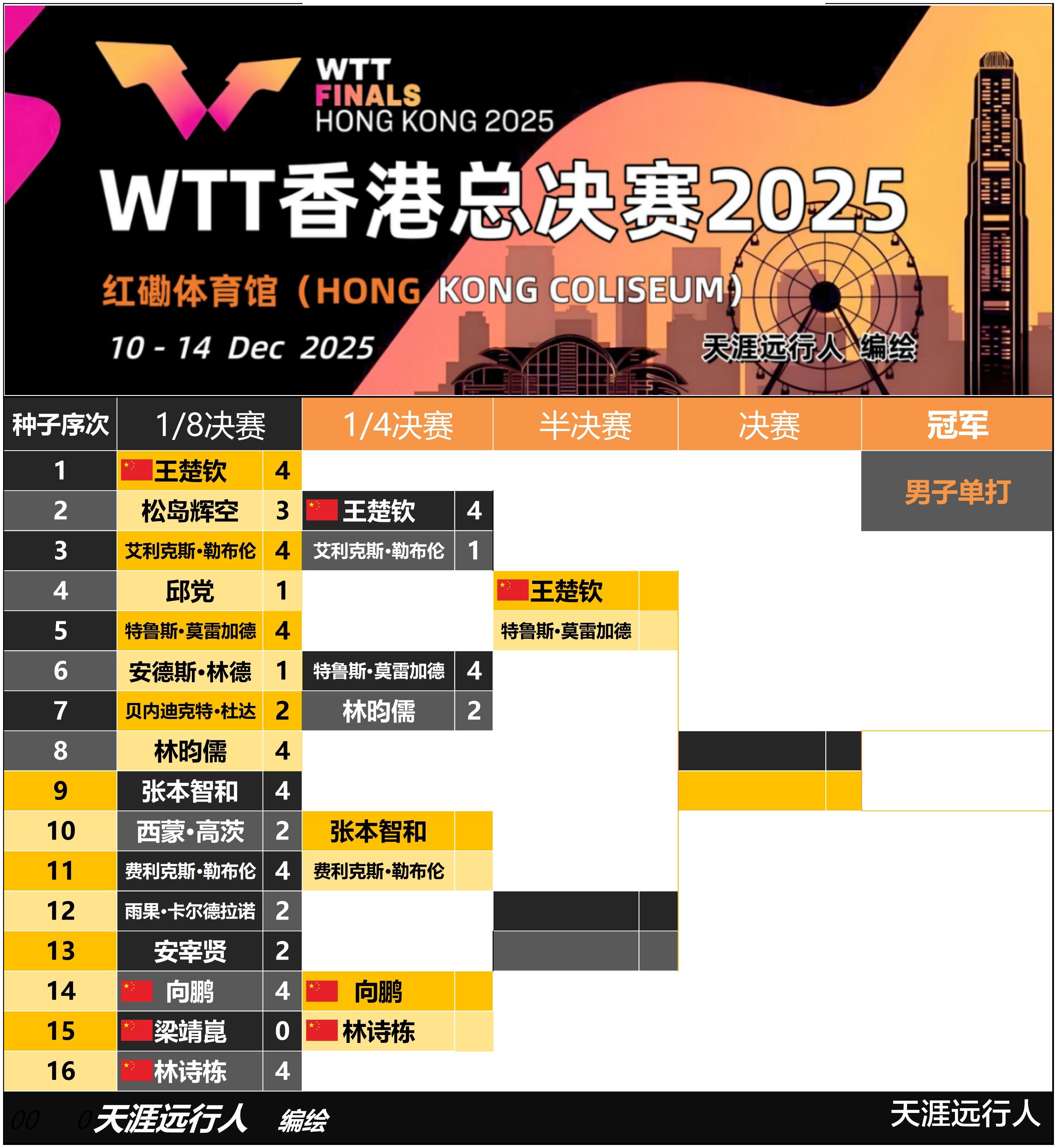 北京时间12月12日22时31分,2025香港WTT总决赛,混双小组循环赛第三轮四场、女子1/4决赛四场和男子1/4决赛前半程两场,共10场角逐,全部决出了胜负,混双和女单四强出炉,男单四强产生两席。