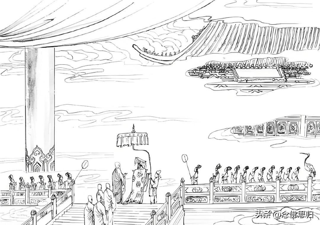 大历四年(公元769年)夏天,法照大师于衡州湖东寺,启五会念佛道场。感五色彩云弥覆其寺,祥云中现出许多楼阁寺宇,阿弥陀佛及二菩萨其身高大,满虚空中。参与法会的人都清楚地见到,个个欢喜踊跃顶礼。上述景象持续了四小时才消失。