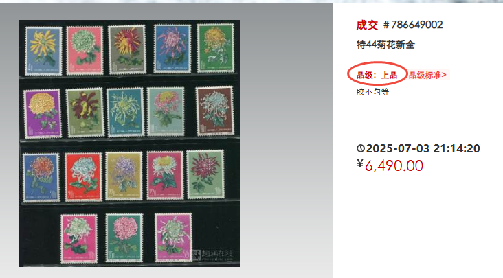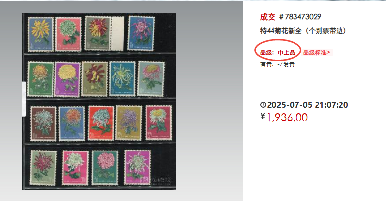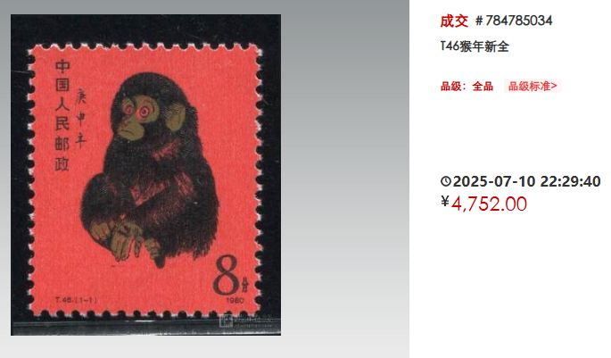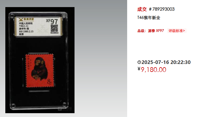 而且经过我观察还发现,源泰XF97分在老赵的溢价十分可观!比如T46猴票,同样是刚刚7月份的成交记录,XF97分接近万元成交!而全品(VF)品相的未评级者则是4750元,差价接近1倍!而且源泰XF97在业内就是冠军分了,目前没有出其右的。我打算之后把手上的好品相邮票都送去试试,看能否搏几个XF97回来。