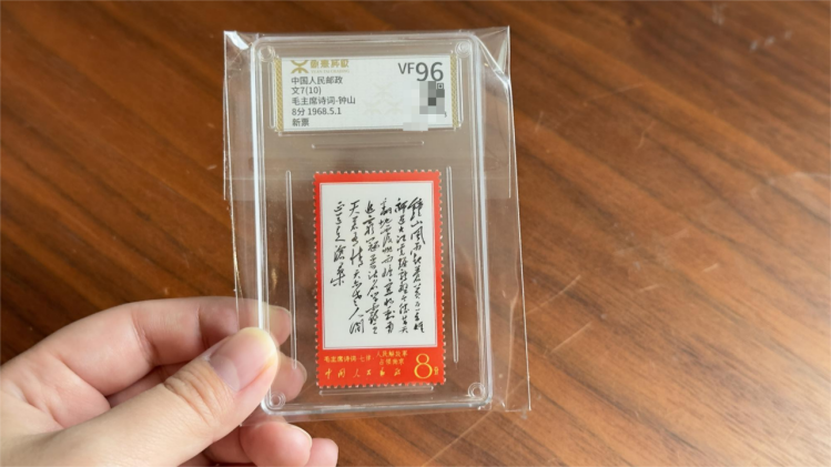 不过综合下来,源泰评级在里面还算靠谱的,经过两个梅雨季节至今还票色鲜艳,背胶百润完好,我常在阳光好的时候放手上细细欣赏,有次没拿稳摔到了地上,结果捡起来盒子毫无裂纹,邮票更是稳稳当当,毫发无损,可谓是非常“硬核”了。