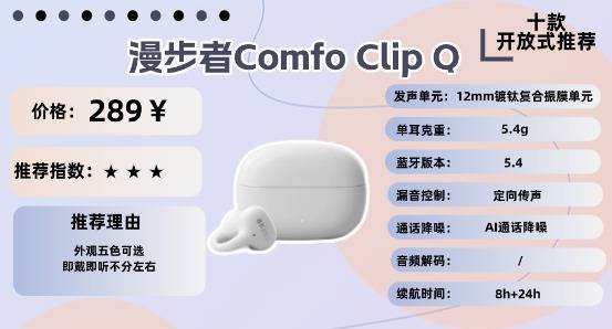 平价开放式耳机好用吗,漫 步 者Co m fo Cl ip Q单耳5.4g,佩戴比较轻松,即戴即听不分左右,省去了区分主副耳的习惯成本。不过耳夹开合力度偏柔,运动较频繁时需要偶尔确认佩戴位置。音质方面,12mm镀钛复合振膜结合进口大黑音圈线声场自然耐听,EQ音效能适配不同曲风,但低频表现偏克制,沉浸感不算强。功能上支持蓝牙5.4、双设备连接以及AI通话降噪,日常通话稳定清晰,还内置DeepSeek与豆包双AI模型,可玩性较高,只是AI功能多依赖APP拓展,部分操作路径稍显复杂。