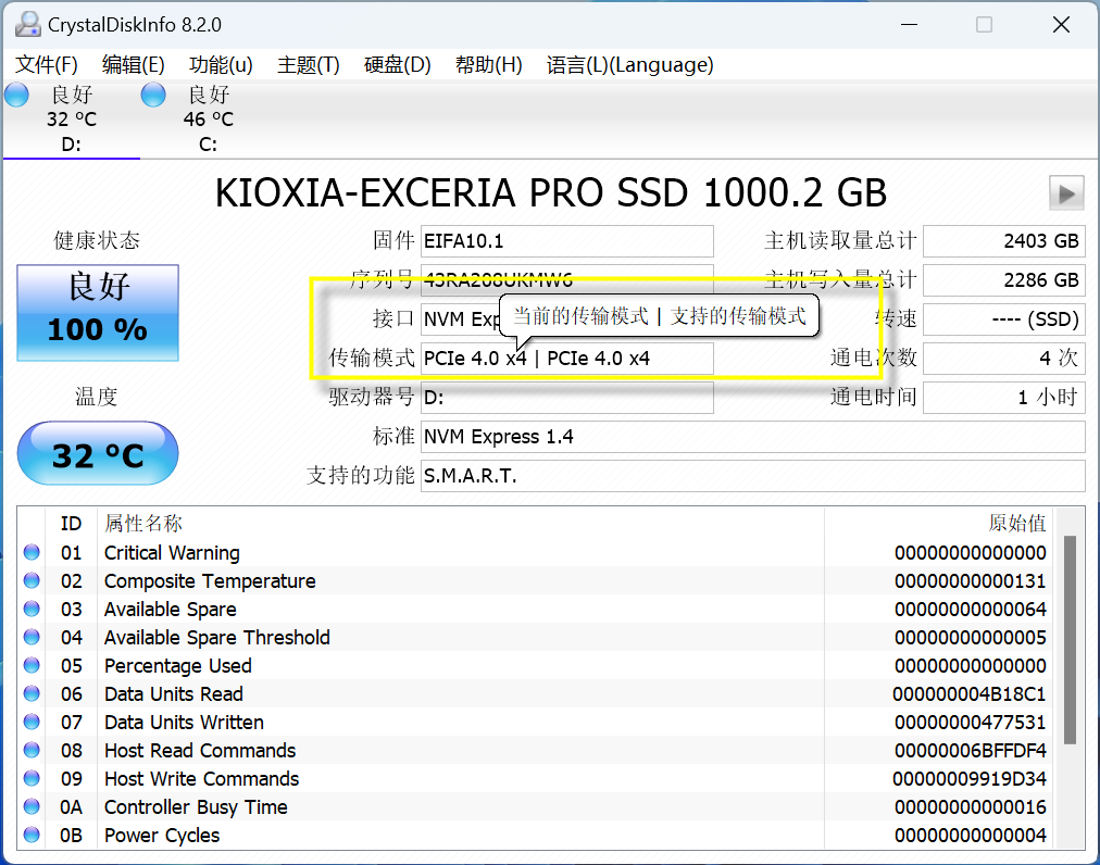 右侧是【支持的传输模式】:PCIe 4.0*4,即按照铠侠SE10的技术规格,所能支持的最大传输模式。