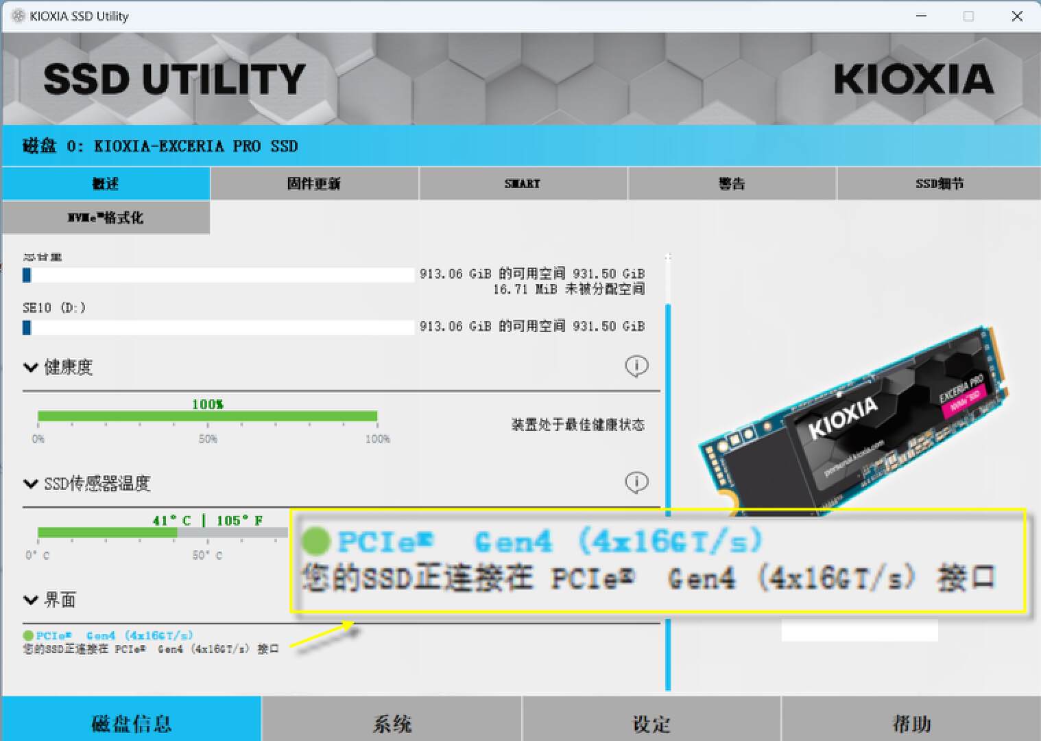 在铠侠SSD Utility管理软件中查看磁盘信息,也能看到:您的SSD正连接在 PCIe Gen4(4*16GT/s)接口。