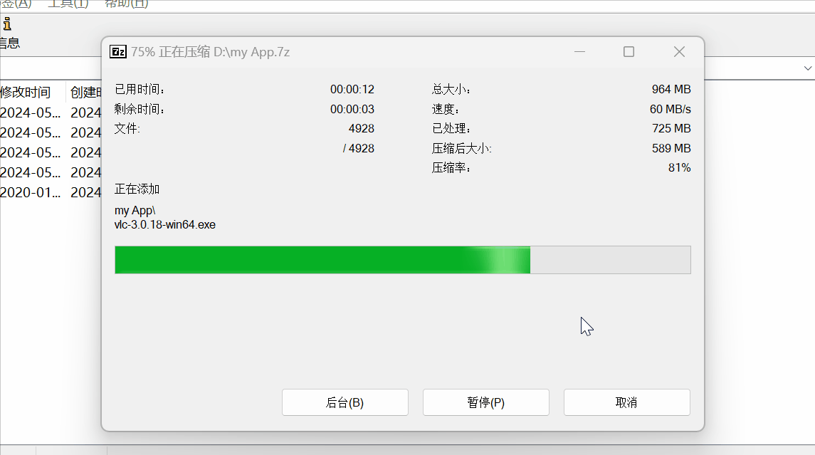 可以看到7-zip压缩速度飞快,仅用时15秒钟,就将整个文件夹的内容压缩至786MB,压缩率为81%。
