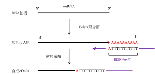 该方法的原理是通过Poly(A)聚合酶在miRNA的3'端添加Poly(A)尾,延长后的序列可与Oligo(dT)引物结合,再进行逆转录。