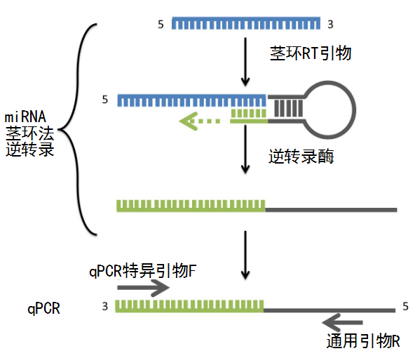 miRNA茎环法逆转录的原理是利用一种稳定的双链结构--茎环(stem-loop)结构作为逆转录引物,与miRNA中目标序列互补结合,形成DNA/RNA复合体,随后利用逆转录酶将RNA序列逆转录为cDNA,从而实现miRNA表达的测量和分析等功能,其过程如下: