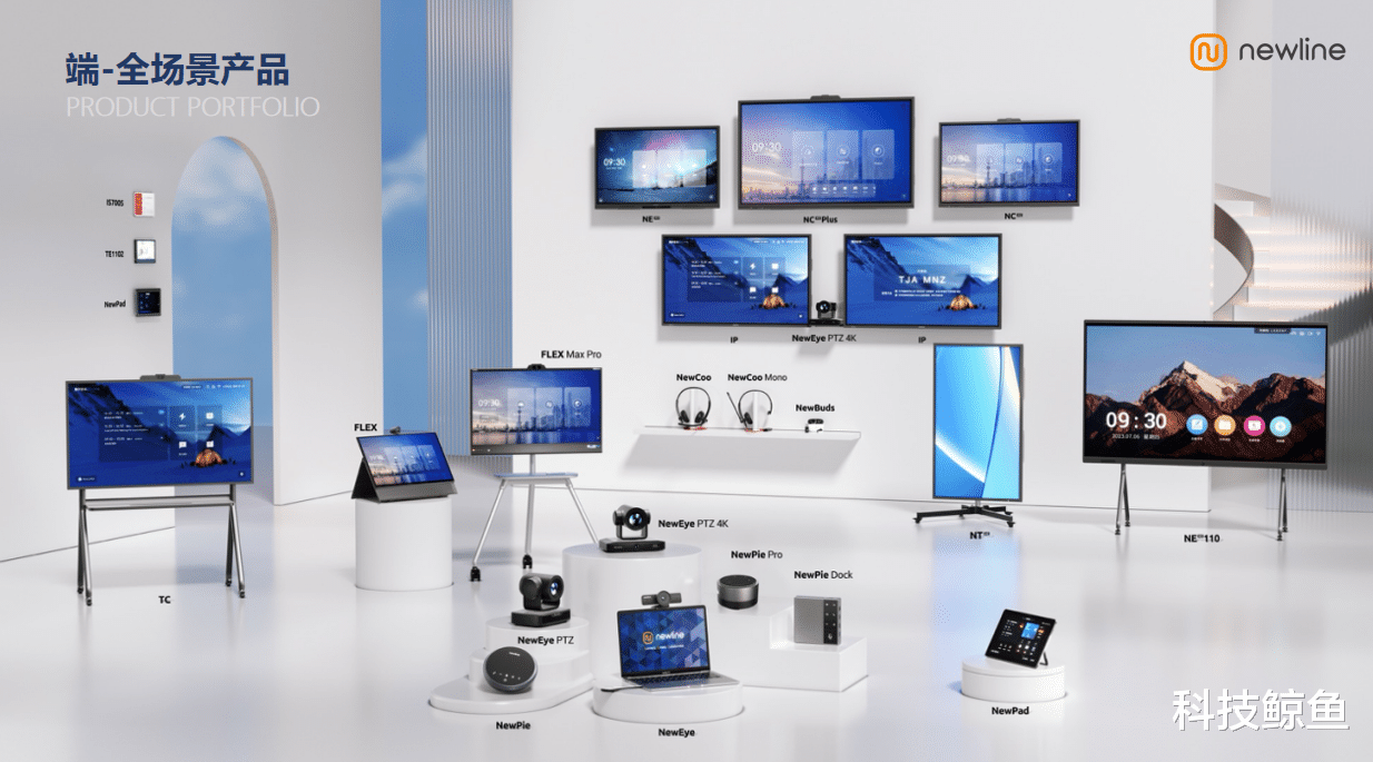 “端” 作为 Newline 触达用户的核心载体,更是把 “全场景” 做到了极致。针对不同应用场景需求, Newline 给出了不同的系列。像TC 系列专业云会议平板的智能取景功能会自动追踪发言者,超远拾音可以让角落的同事也能清晰表达; NE 系列交互平板上,绘画级书写精度能还原设计师笔下的每一条曲线,零贴合屏幕让触控手感堪比纸质画板;ND 系列平板,倒装 COB 工艺呈现的 4K 超清画面,能让 BIM 模型的每一根钢筋都清晰可见;再加上 NewEye 4K 云台摄像头、NewCoo耳机、 Newpie 麦克风等外设,Newline 构建了从 “个人桌面” 到 “大型会场” 的完整硬件矩阵。