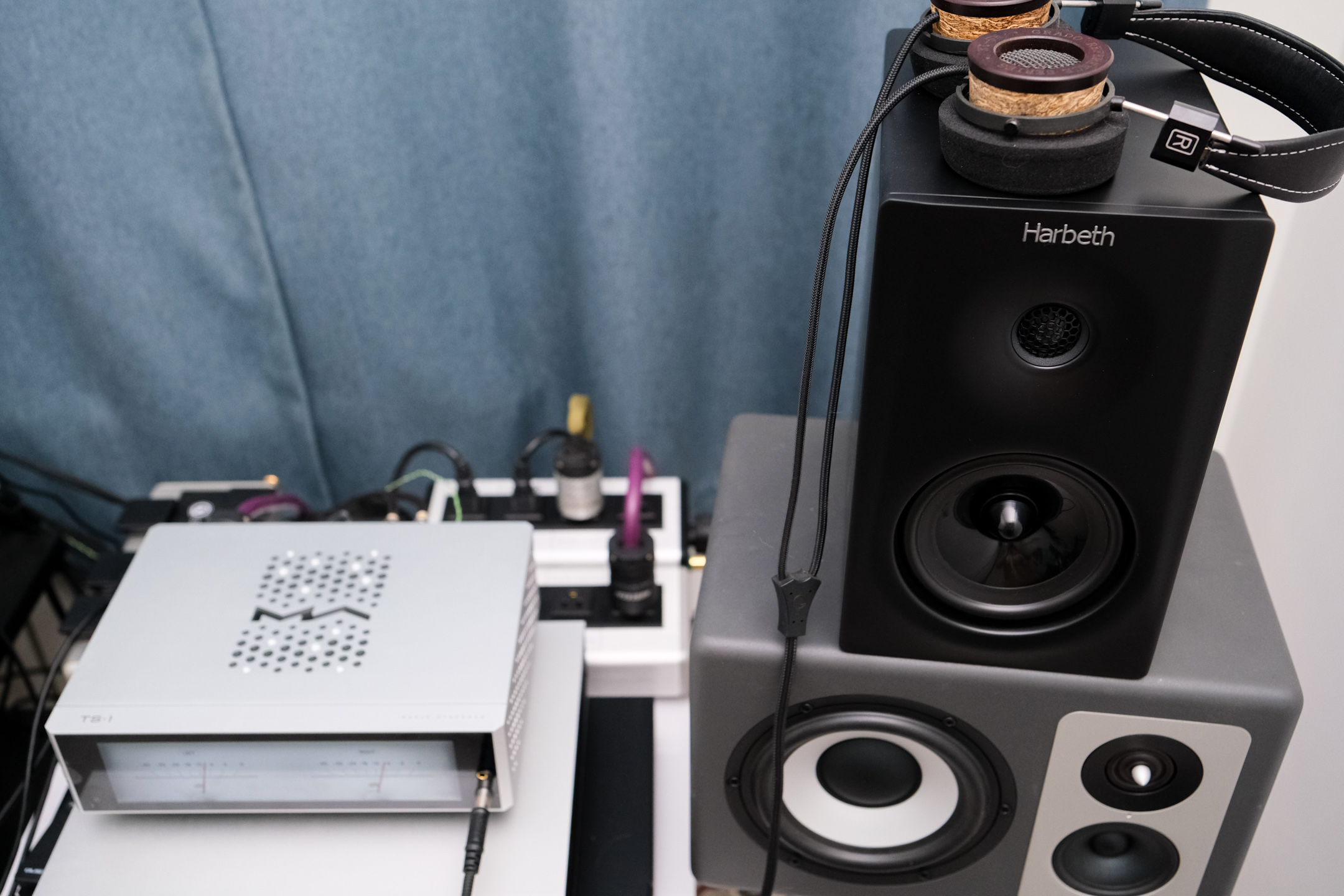 就把TS-1解码直通给手头的飞傲K17的放大部分了,后面K17平衡驱动英国Harbeth雨后初晴,刚出的,有源音箱NLE-1。
