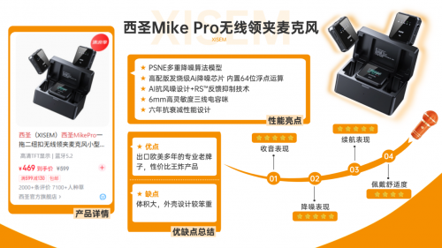 西圣Mike Pro在无线麦克风领域里享有很高的人气和口碑。这款麦克风在收音效果、降噪能力以及硬件配置等方面,都是无线麦克风中极为顶尖的产品,也是众多音频设备爱好者极力推荐的品牌,前段时间被各大数码媒体评为2024年无线领夹麦克风“性价比之王”,其专业品质和畅销热度得到了进一步的提升和认可。
