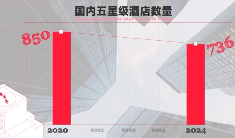 数量锐减:2020年至2024年,国内五星级酒店数量从850家下降至736家,114家酒店在4年间“消失”。