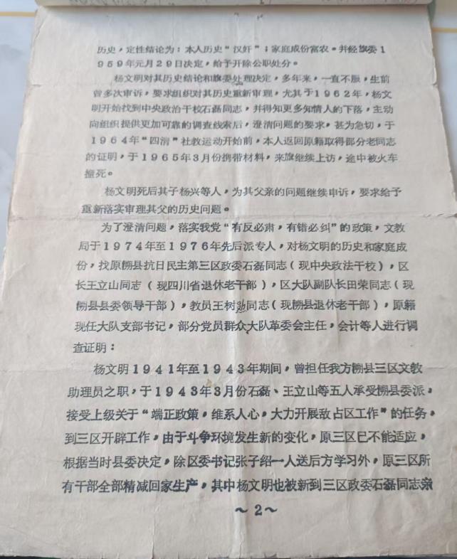 该决定同时撤销了1958年对杨文明“日伪汉奸”的认定以及开除公职的处分。但在结论部分又指出:“1947年冬因群众要按日伪汉奸抓他,闻风而外逃内蒙,性质属于脱离革命,对其历史上的汉奸嫌疑历次运动作为审查对象是应该的;对于杨文明富农家庭成份,根据当地群众证明,划定偏高,但我旗不予议纠,应由家属向原籍申诉解决。”