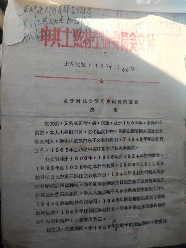 在杨发家中,那些泛黄的文件和史料被精心保存。随着时间流逝,这段历史记忆正逐渐模糊。但对他而言,这不只是为父亲个人正名,更是对一段真实历史的尊重。他表示,希望山西有关部门对1947年错案予以平反,恢复杨文明及其配偶的革命身份与名誉;土左旗纠正错误定性结论,消除政治影响,这既是对历史的负责,也是对当年那些冒着生命危险从事地下工作的革命者的告慰。