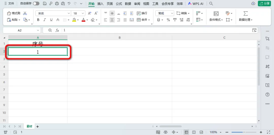 2.点击「A2」单元格,在单元格内输入数字「1」。(这是序号的第一个数值,后续序列会从这个数字开始递增。)