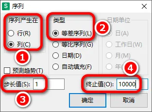 (“等差”意味着每个序号比前一个多固定数值,适合生成连续序号;若选“等比序列”,会生成倍数递增的序号。)