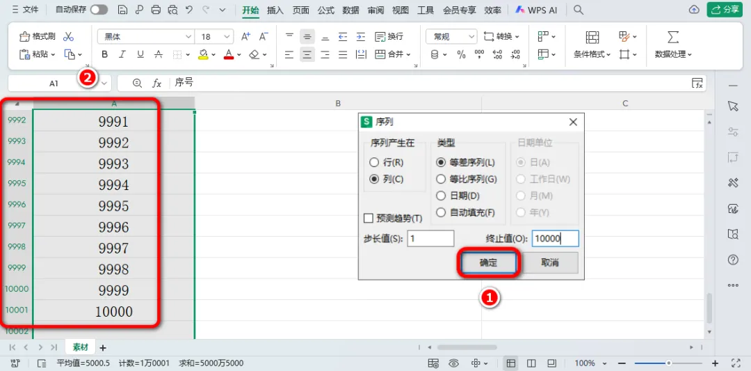 此时Excel会自动从A2单元格开始,向下填充序号,从1一直到10000,全程不到1秒,无需手动干预。