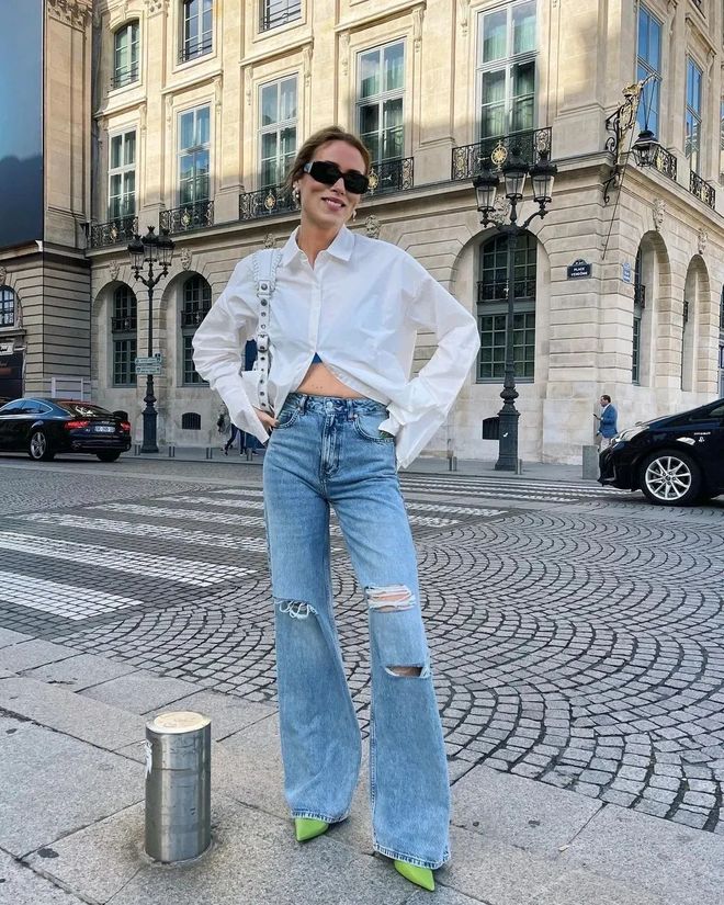 高腰阔腿裤+短上衣的“上短下长”穿法,巧妙拉高腰线,显高又显瘦。