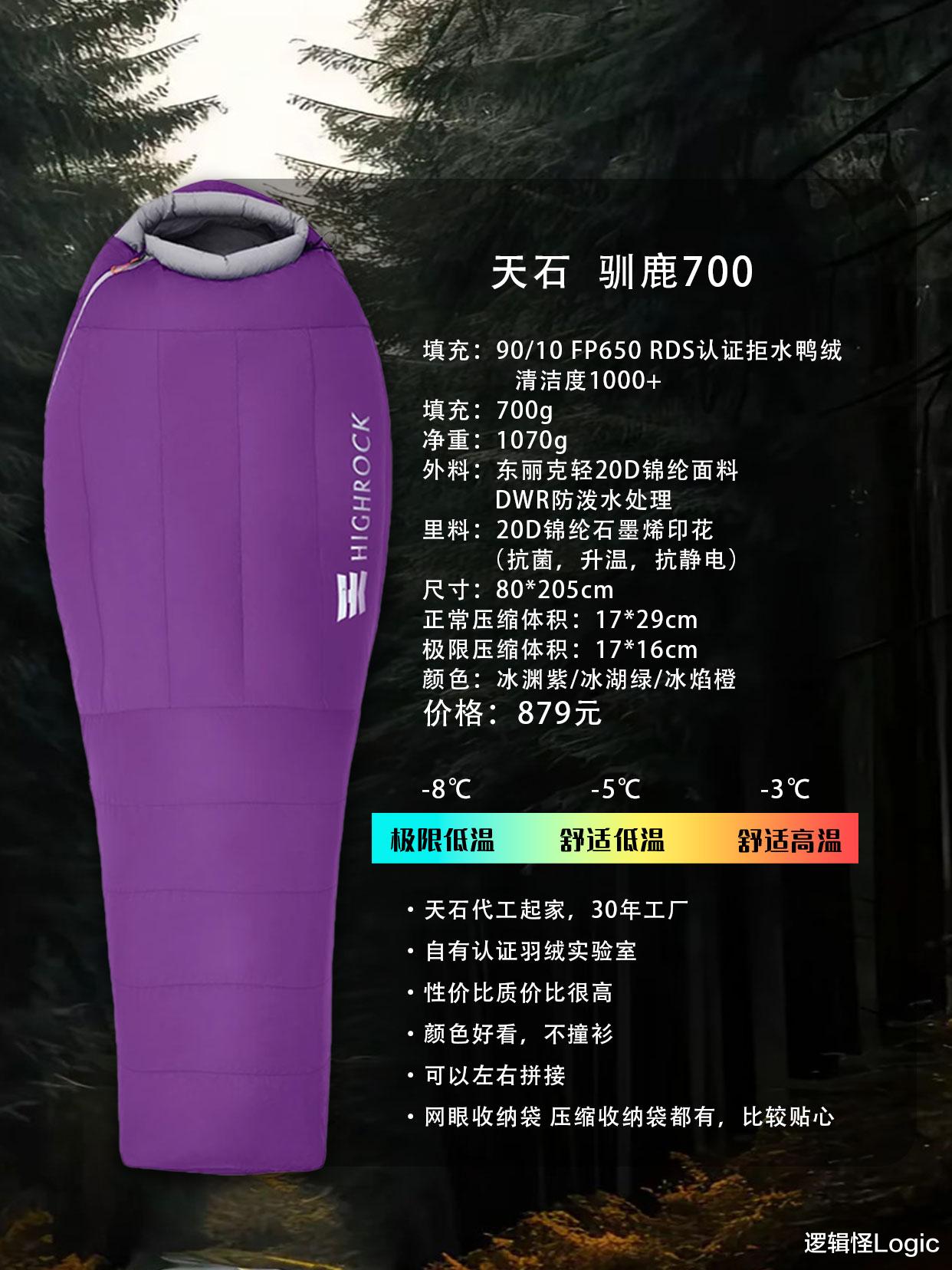 【天石 驯鹿700】这款睡袋采用700g 90%绒子含量的650FP+RDS拒水鸭绒,蓬松度高、清洁度达1000+,保暖性能出色。外层为东丽20D轻量锦纶配DWR防泼水处理,内里使用石墨烯印花面料,具备抗菌、升温与抗静电功能,兼顾舒适与科技感。净重仅1070g,压缩后体积小(极限17×16cm),适合长途徒步或背包旅行。支持左右拼接设计,方便情侣共用;附带网眼与压缩收纳袋,细节贴心。颜色独特(冰渊紫/冰湖绿/冰焰橙),辨识度高,不撞衫。
