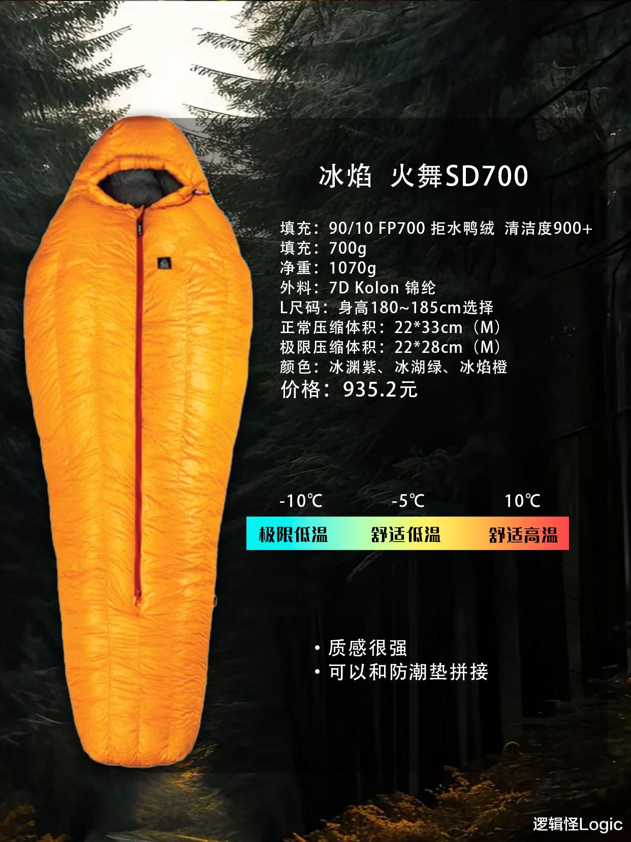 【冰焰 火舞SD700】采用700g 90%绒子含量、700FP拒水鸭绒,蓬松度领先,保暖性出色。外层为7D Kolon超轻尼龙,轻盈柔软,质感出众。净重1050g,压缩体积小巧(极限22×28cm),便携性强。舒适温度范围广(-5℃~10℃),适合多季节使用。特别设计可与防潮垫拼接,提升空间利用率和舒适度。单色黄色,辨识度高,适合追求个性与实用结合的用户。