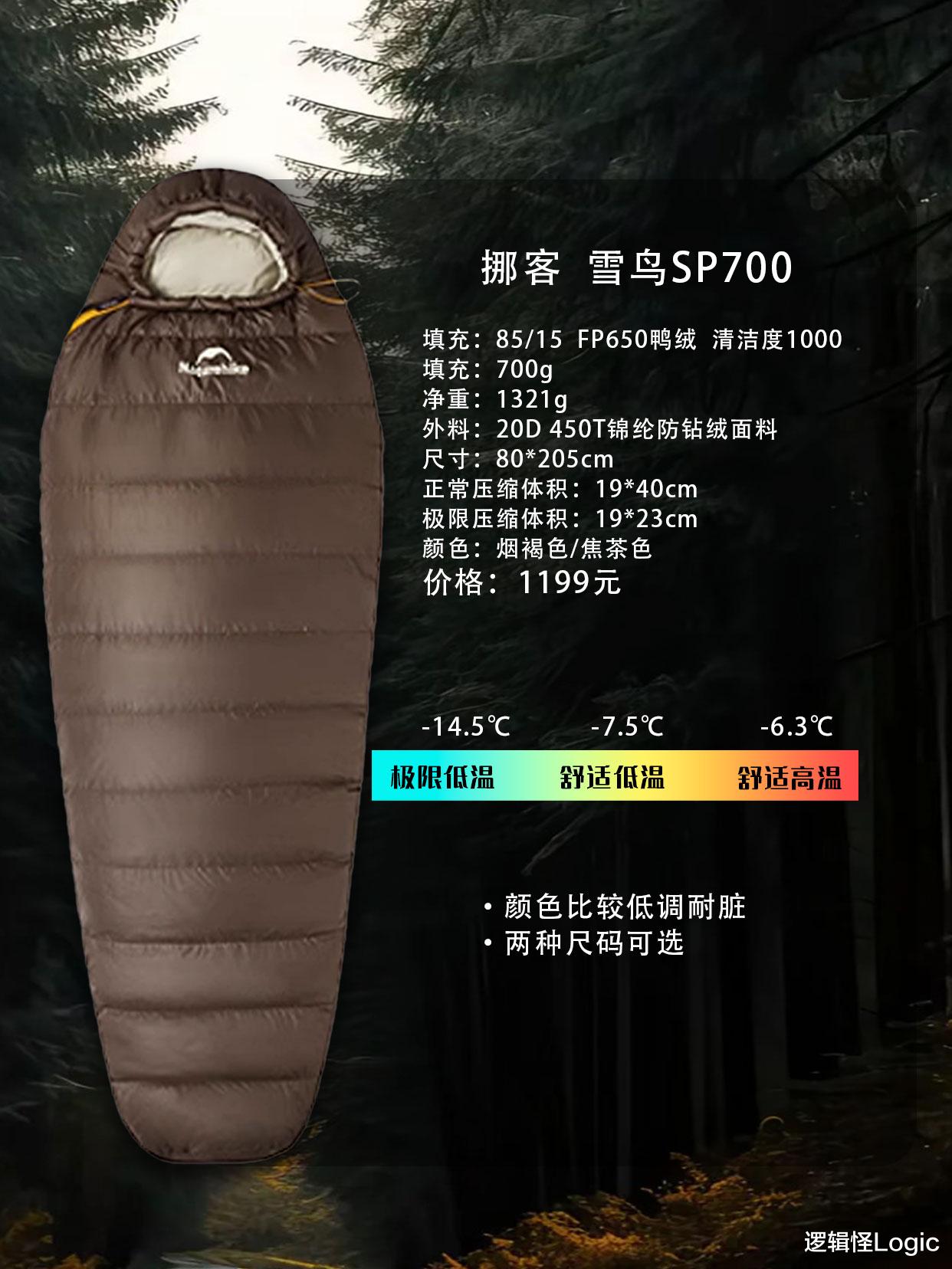 【挪客 雪鸟SP700】以85%绒子含量、650+FP高蓬鸭绒打造,充绒量700g,保暖性强,极限温度低至-14.5℃,更适合寒冷环境。净重1321g,相对偏重,但耐用性更强。采用20D 450T尼龙防钻绒面料,抗撕裂、防钻绒表现优秀,适合严苛地形。提供烟褐、焦茶两色,风格沉稳耐脏。尺寸可选L/M,适应不同身高需求。虽价格较高(1199元),但在极端低温环境下更值得信赖。