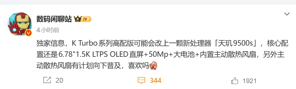 根据爆料,OPPO K15 Turbo Pro的处理器更换为了天玑9500s,又是一个新处理器,猜测此处理器为天玑9400+的升级版,不知道和天玑9500e是不是一个。