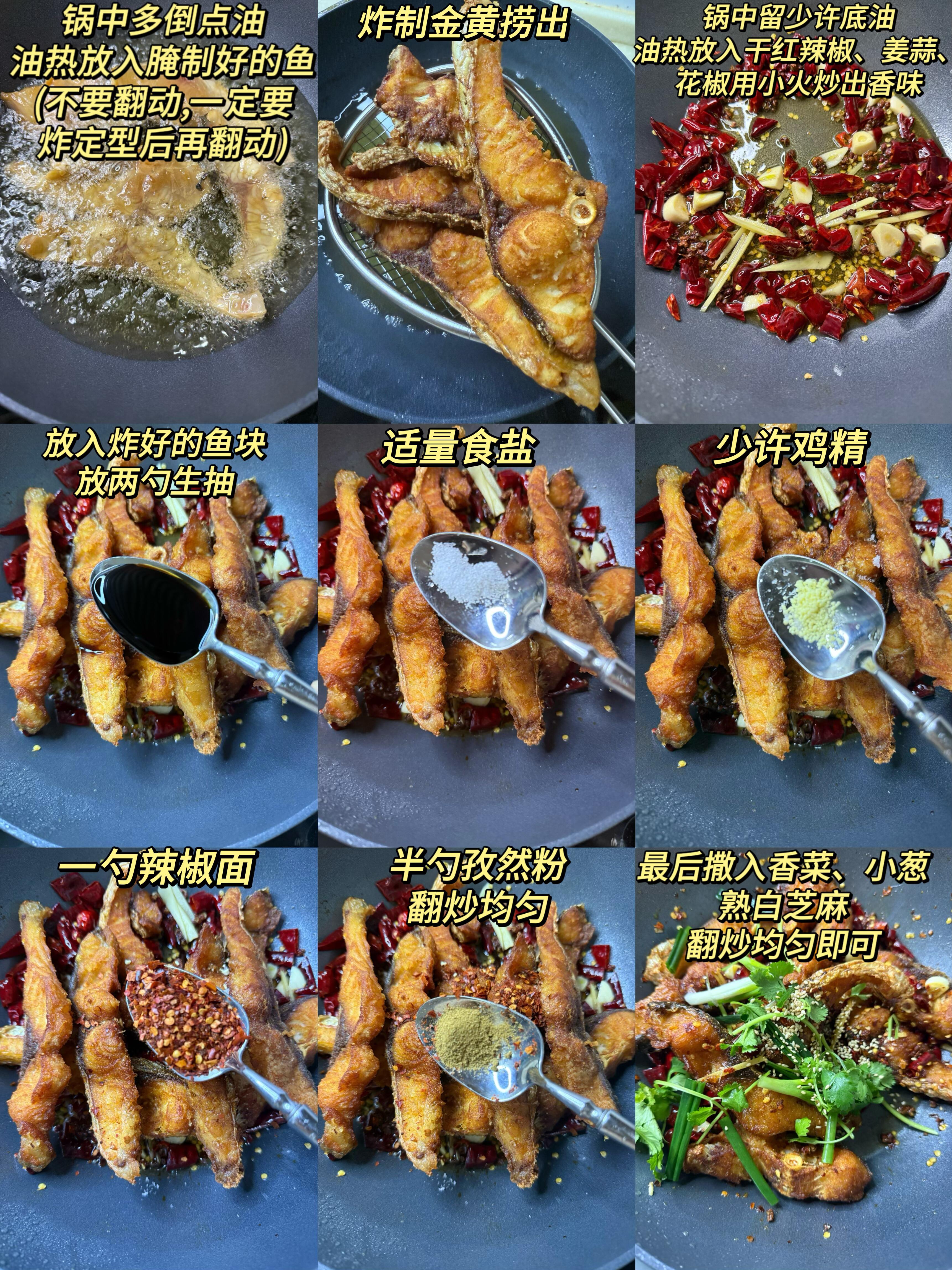 最香的步骤来啦!另起锅放少许油,爆香蒜末、干辣椒段和花椒,喜欢吃麻的可以多放几粒花椒。接着加1勺生抽、半勺老抽、1勺香醋、1勺白糖、少许盐,翻炒出香味后,倒入煎好的鱼块,快速颠锅拌匀,让每块鱼都裹满酱汁。最后撒一把熟芝麻和葱花,关火焖1分钟,让味道再渗透一下,香辣鱼块就做好啦!