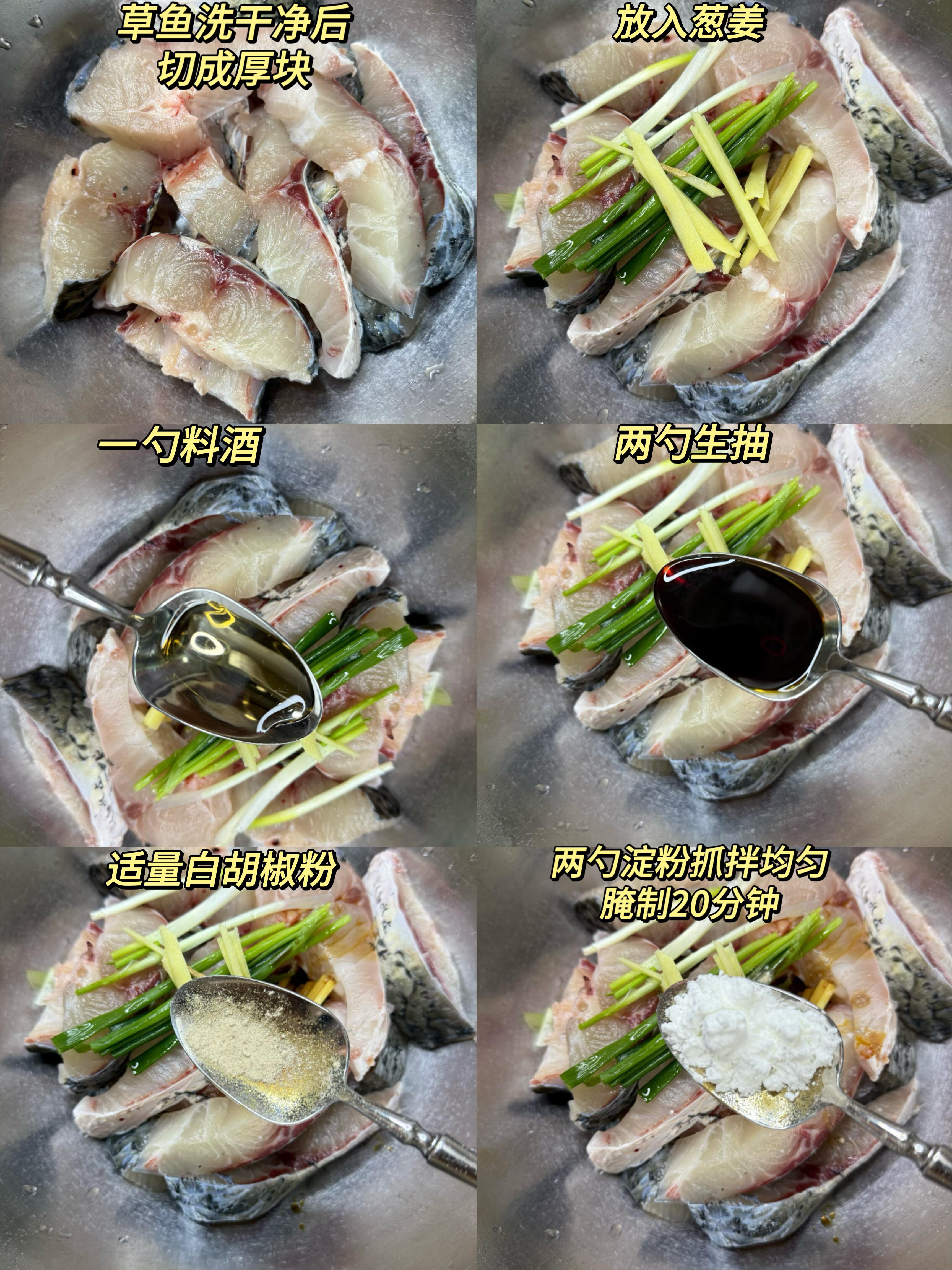 处理鱼块有个关键步骤,能让鱼肉不柴不腥:鱼块洗净后,用厨房纸吸干表面水分,加1勺料酒、2片姜片、1小勺盐,用手抓匀腌制15分钟。腌好后倒掉渗出的水分,再用厨房纸擦干——这步千万别省!水分是煎鱼不酥、容易溅油的“元凶”,擦干的鱼块煎起来才会金黄焦脆。