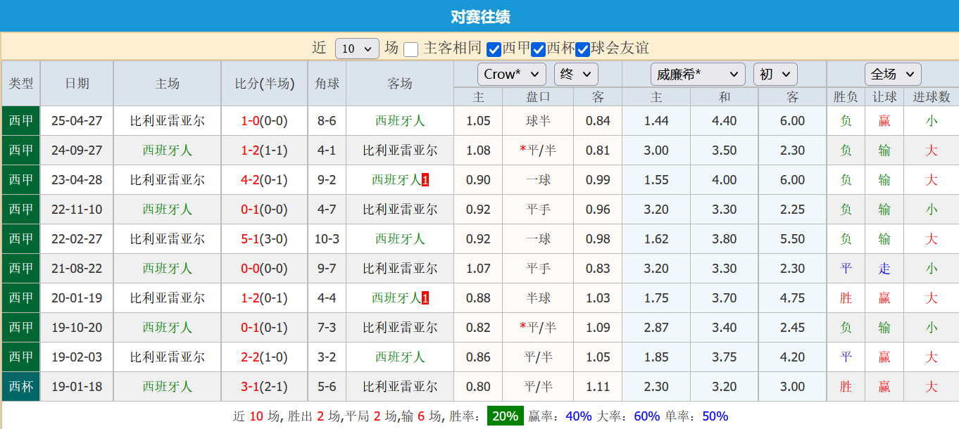 请看上面双方基本面。西班牙人主场开赛以来相当猛,411仅输一场;黄潜的客场战绩并不突出,主场枪分多;如果波菜开客让平半低水或半球,那么绝大部分玩家都会毫不犹豫的看黄潜赢球;毕竟历史优势太明显。