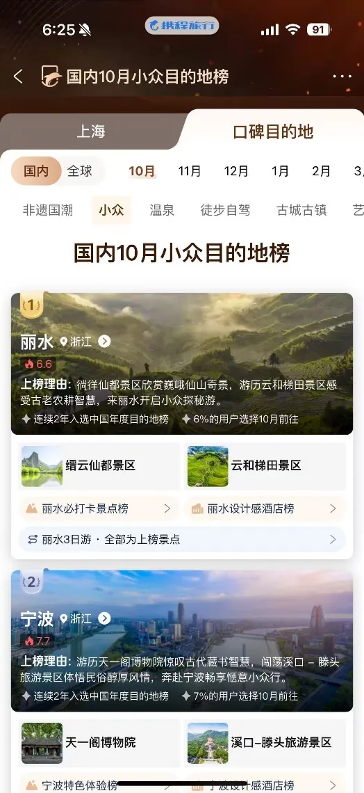 更关键的是,真人的参与也能让榜单在热门假期时更具灵活和参考性。比如今年国庆长假前,携程口碑榜“国内 10 月小众目的地”就直接剔除了热门扎堆的景点,转而将丽水云和梯田、宁德霞浦、甘南扎尕等 20 处“低热度、高体验”的国内目的地及景区纳入榜单。