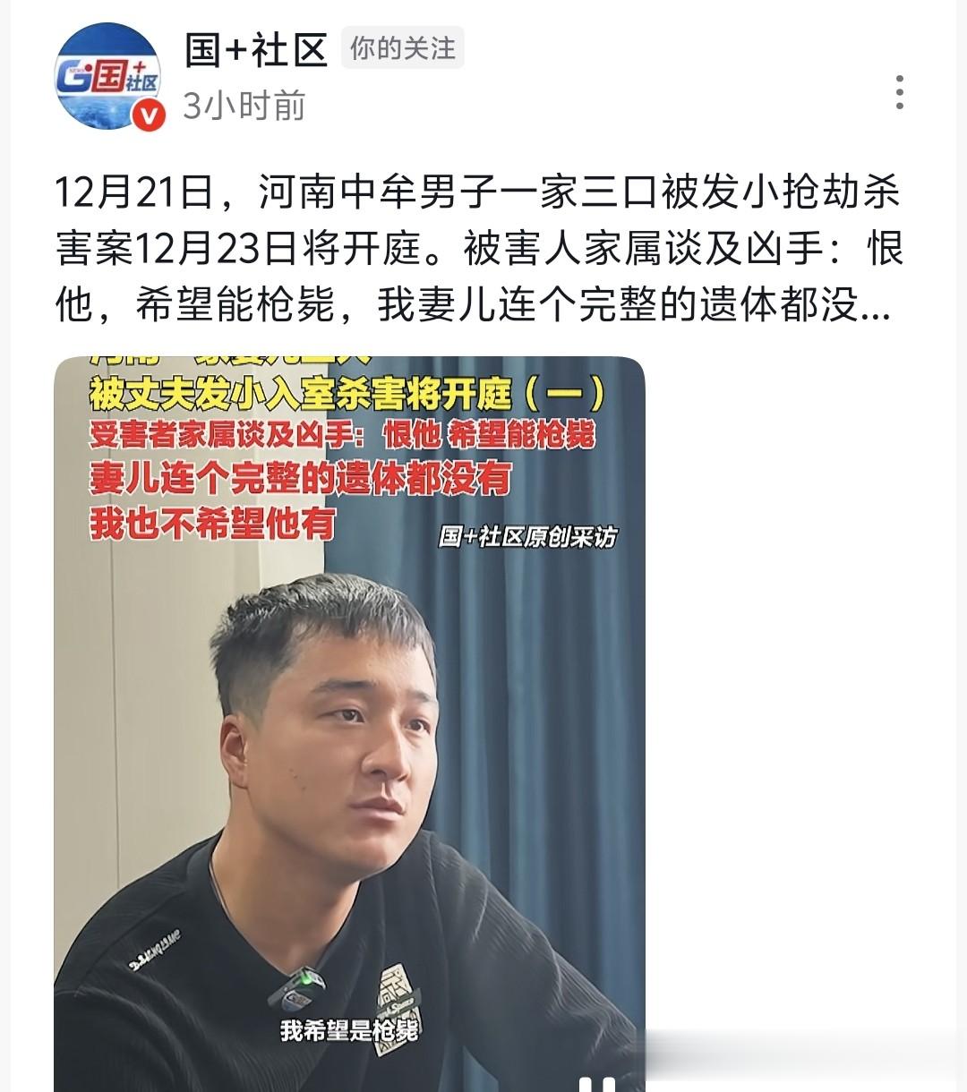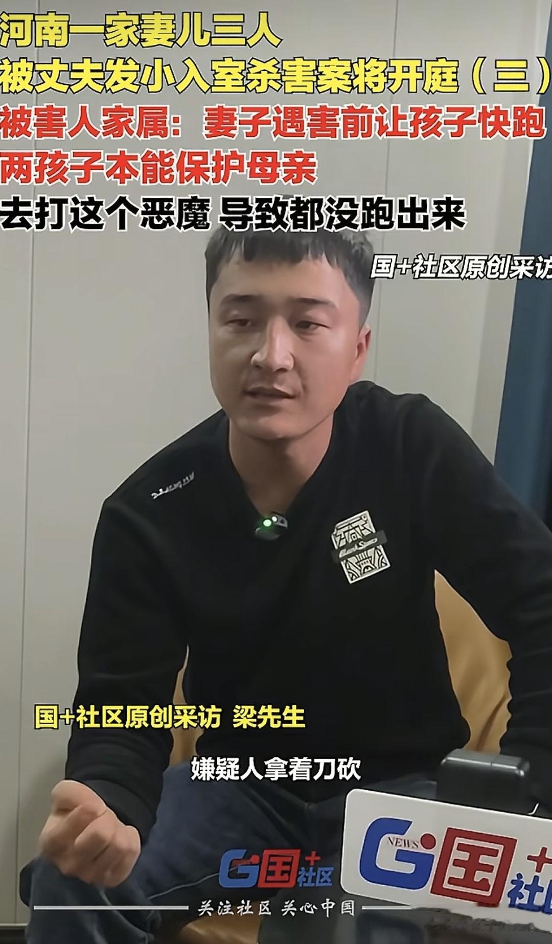 12.21日消息,河南一男子杀害发小妻儿案即将开庭,下周就会迎来审判有结果。遇害者家属梁先生接受了媒体采访。