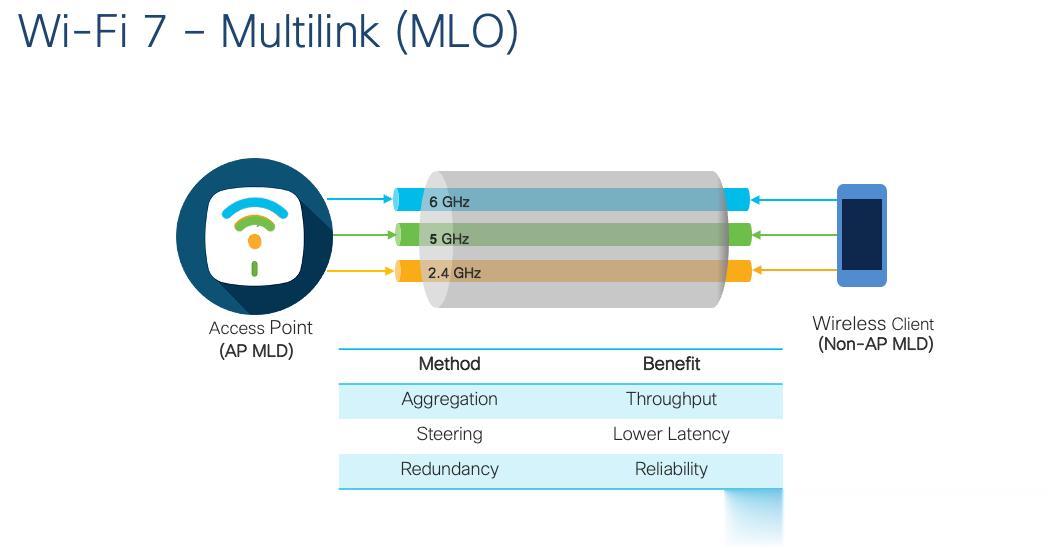 MLO多链路操作(真正革命性功能)这才是Wi-Fi 7的“杀手锏”!设备可同时使用2.4/5/6GHz三个频段(或任意组合),动态聚合、切换、冗余。
