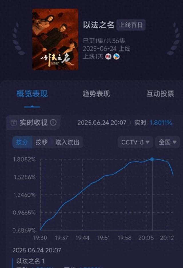 雷佳音、岳云鹏主演的《长安的荔枝》正式收官了,央视八套接档这部剧的是一部观众备受期待的司法大剧《以法之名》,于6月24日19:30在央视八套开播,网播平台则在优酷!网播4集,央视播出2集。第一集酷云起点0.68,开播7分钟破1,轻松拿下全国收视第1的宝座。第一集央八结束,酷云收视率峰值拔到1.8了,还是比较流畅的,看来后续破2都没问题了。