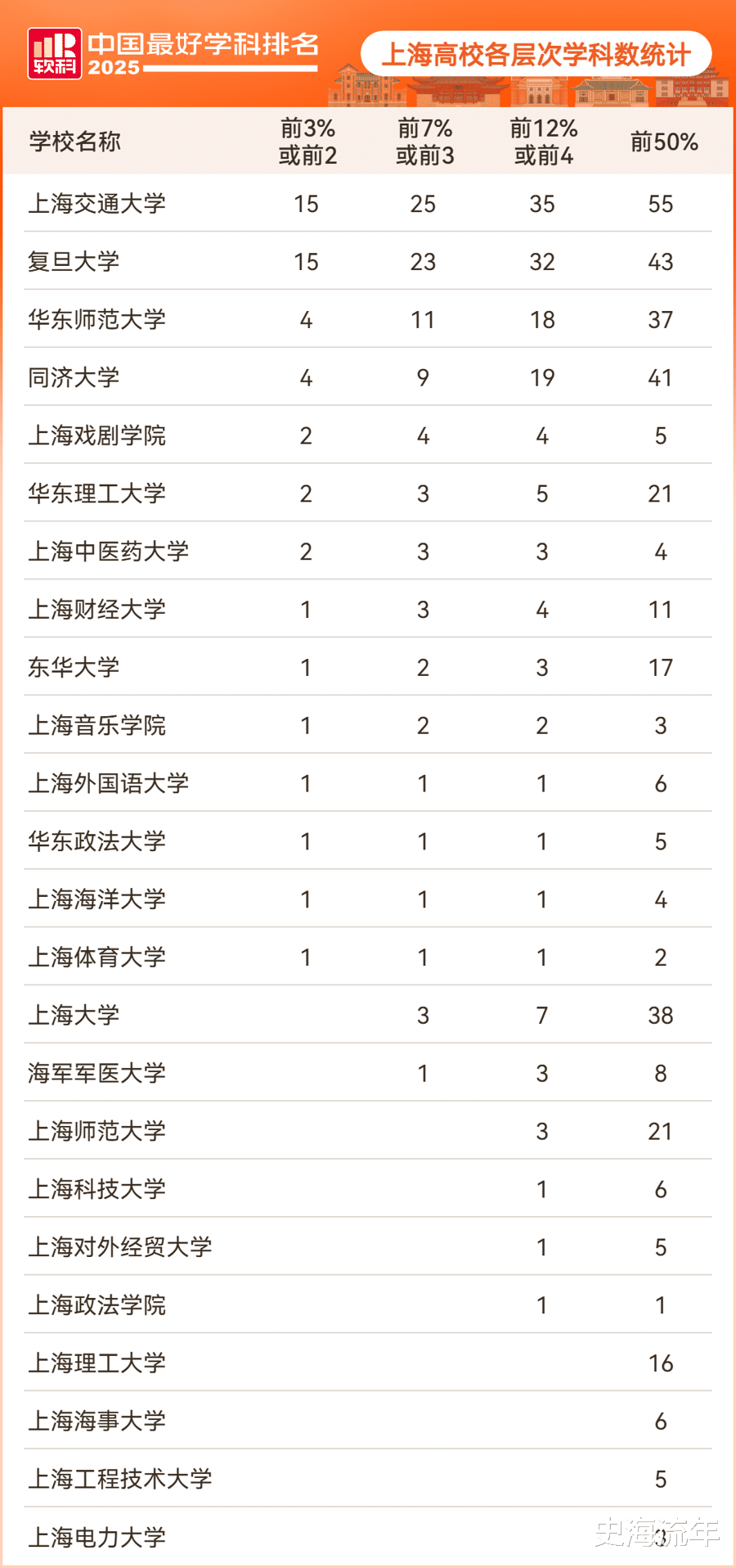 10月15日《软科2025年中国最好学科排名》发布,上海高校各层次高校学科数最统计,上海交通大学以55个排名第一位,复旦大学以43个排名第二位,上海大学以38个排名第四位。