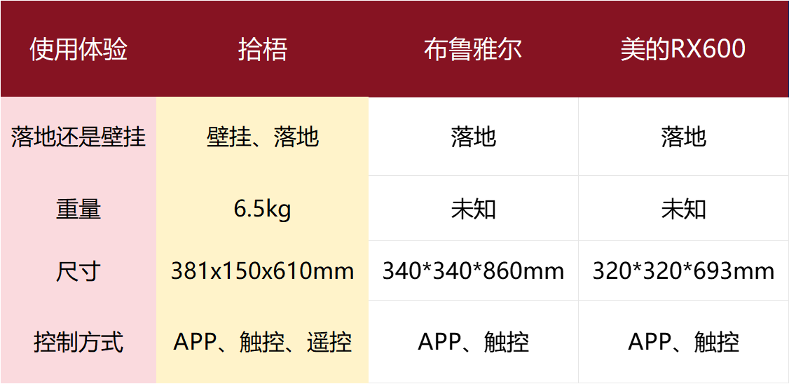 布鲁雅尔7710i和美的RX600则均为落地式设计,安装位置受限,无法像拾梧那样灵活利用墙面空间。两者在重量上未公布明确数据,但尺寸都偏大。在操控方式上,它们只支持APP和触控,功能较为单一。